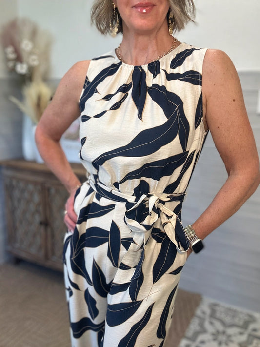 Leaf Print Tie Waist Jumpsuit
