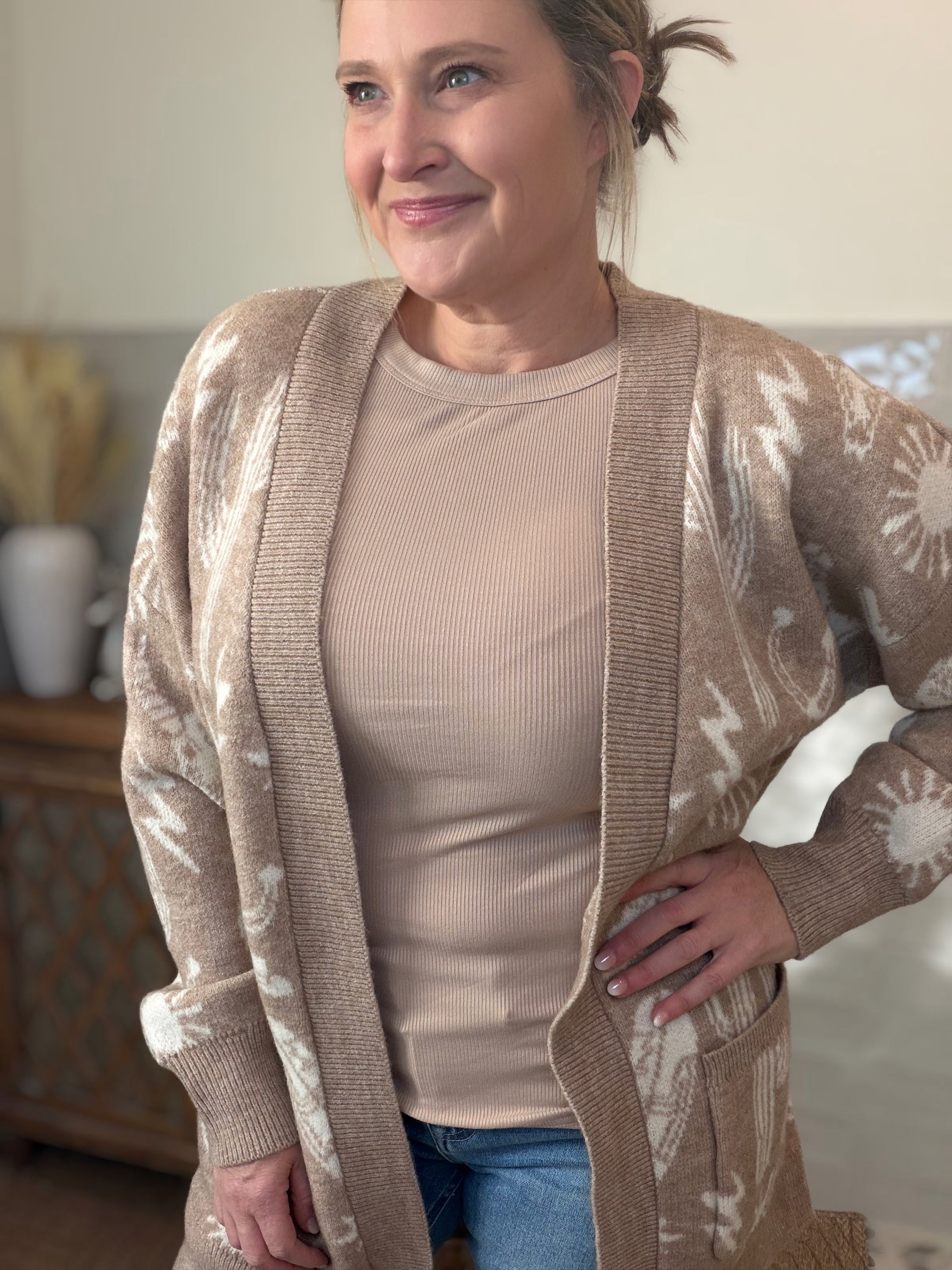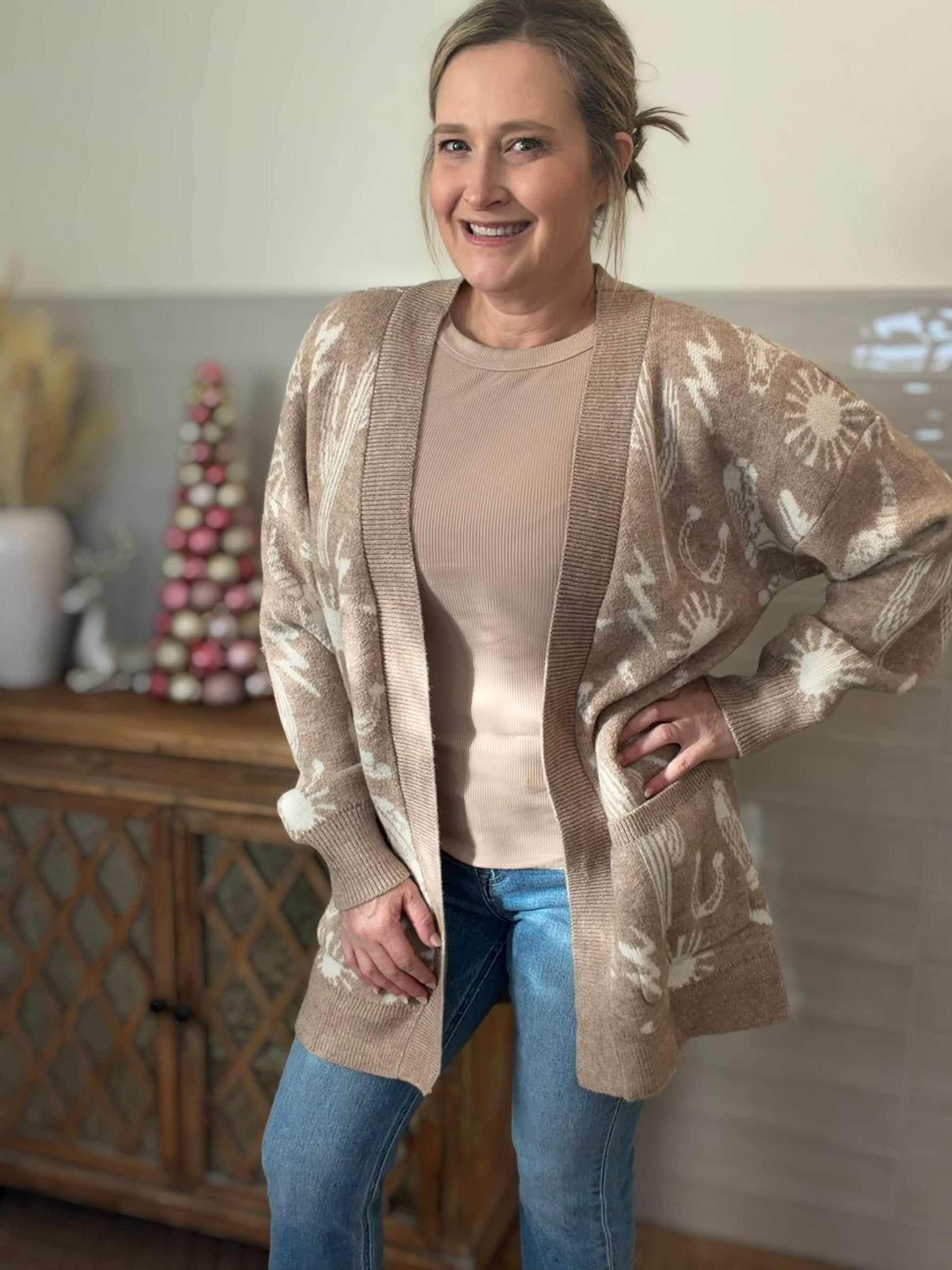 Channel bold Western vibes with this eye-catching Oversized Knit Sweater Cardigan. The relaxed drop-shoulder silhouette and tunic length create an effortlessly chic aesthetic, while practical front pockets add everyday functionality. Long sleeves and an open-front design make layering seamless, and the striking graphic print ensures you'll stand out in the best way possible.