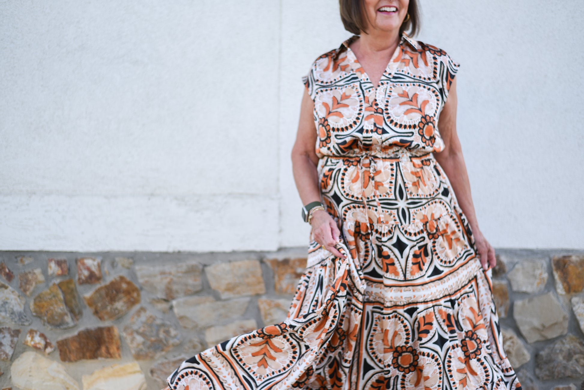 Embrace elegance with this floral maxi dress, showcasing a timeless collar and sleeveless style. The elastic waistband with a drawstring ensures a customizable, flattering silhouette—ideal for weddings and sophisticated events.