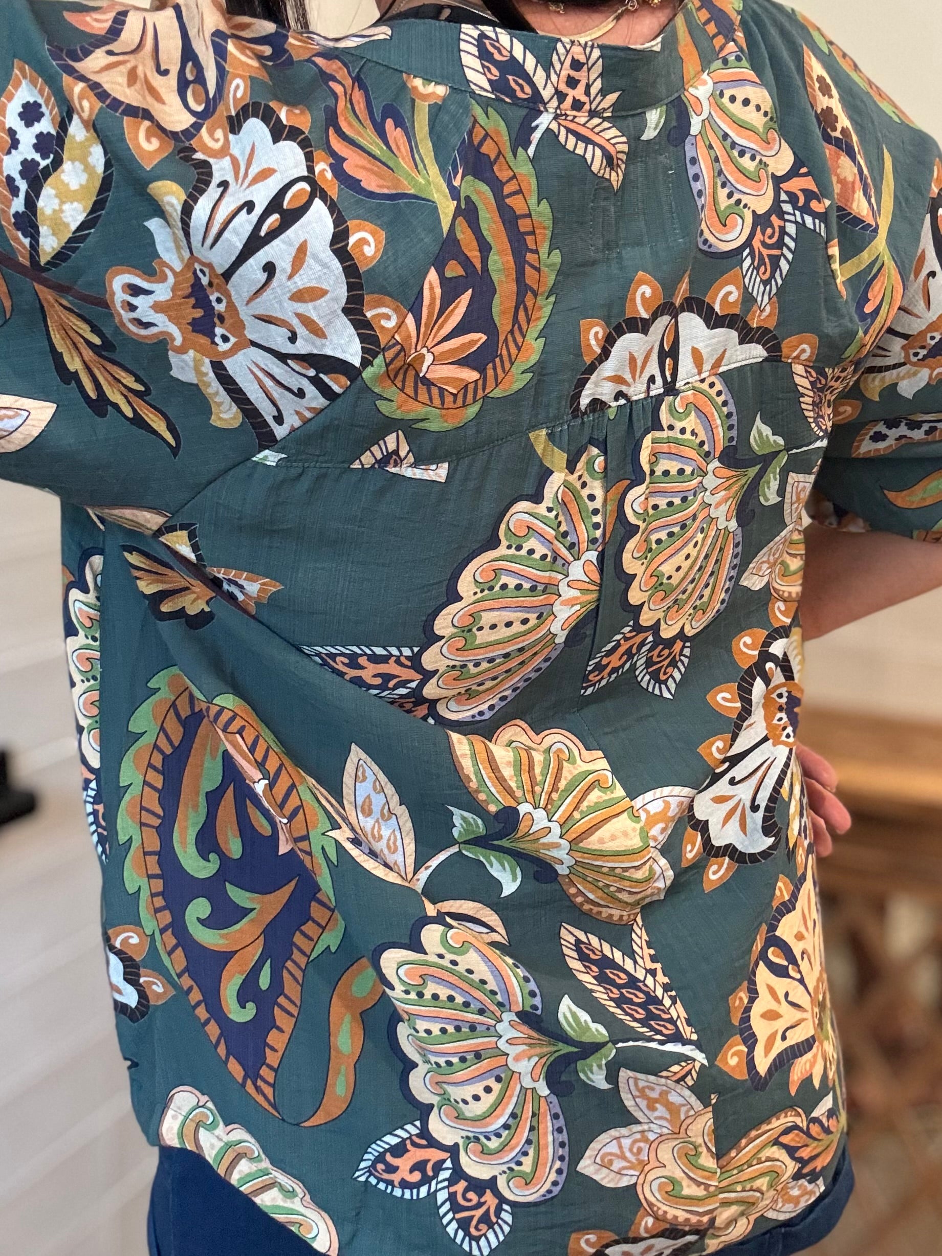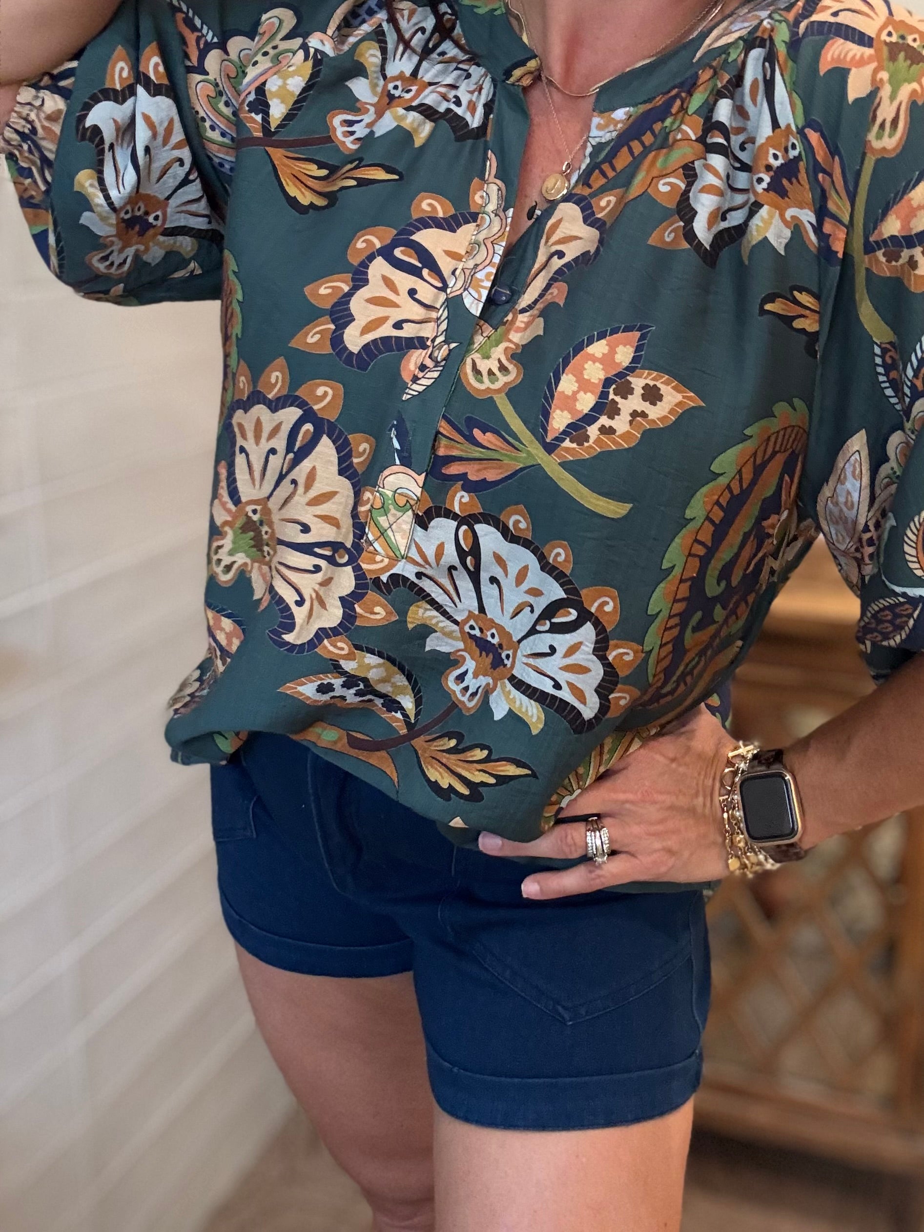 Elevate your style with the Boho Paisley Puff Sleeve Blouse in teal. Featuring a flattering split neckline and charming 3/4 puff sleeves, this blouse is detailed with mid-button accents for a unique touch. Designed without lining, it offers a lightweight, breathable fit perfect for any occasion.