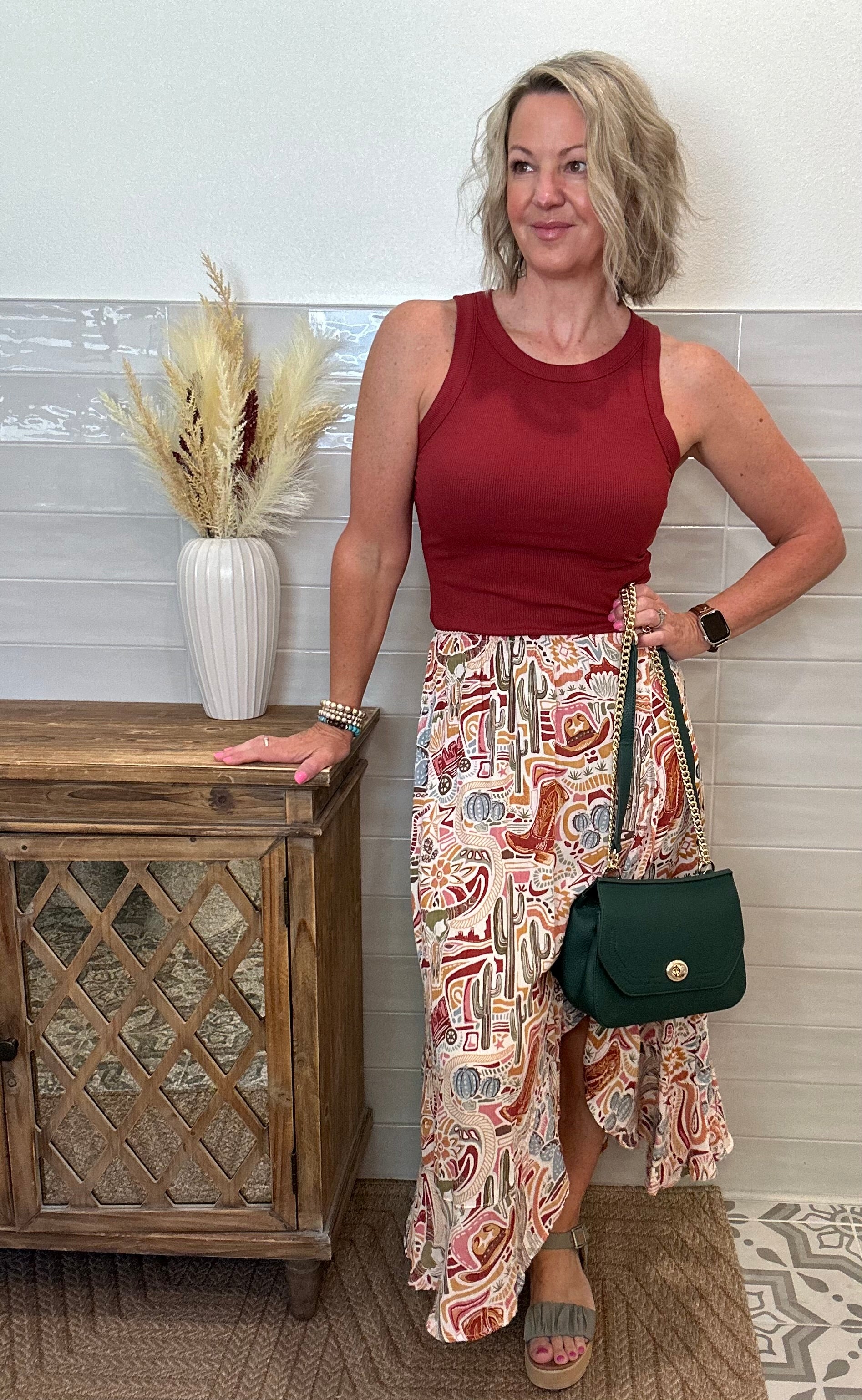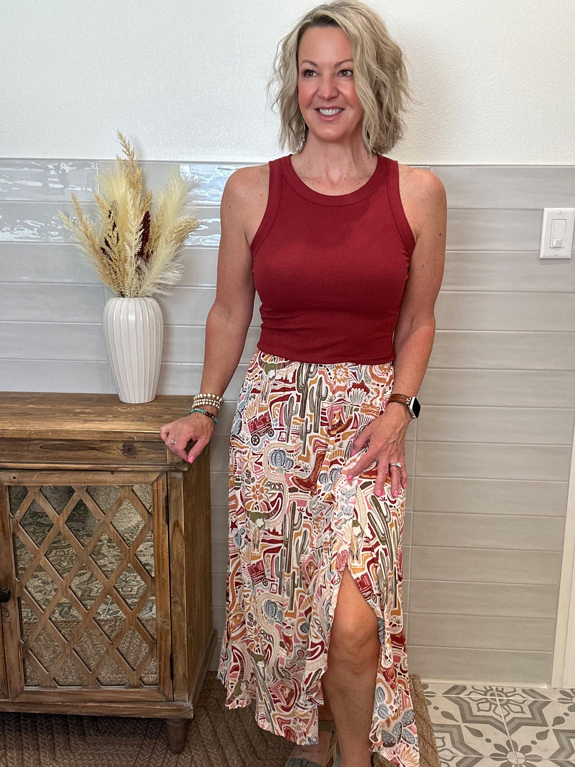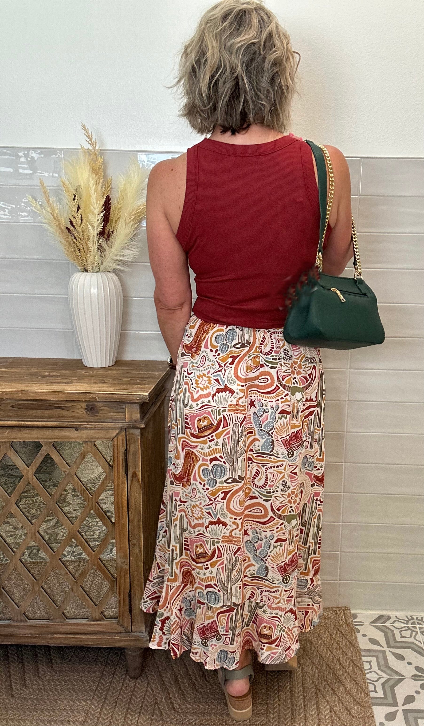 This Western Cactus Print Ruffle Slit Skirt is a testament to the bohemian spirit. Its beige, a-line design is both pretty and sophisticated, adorned with a unique cactus and western graphic for an eclectic touch. Ruffles add a feminine flair, making it perfect for everyday wear or day parties.