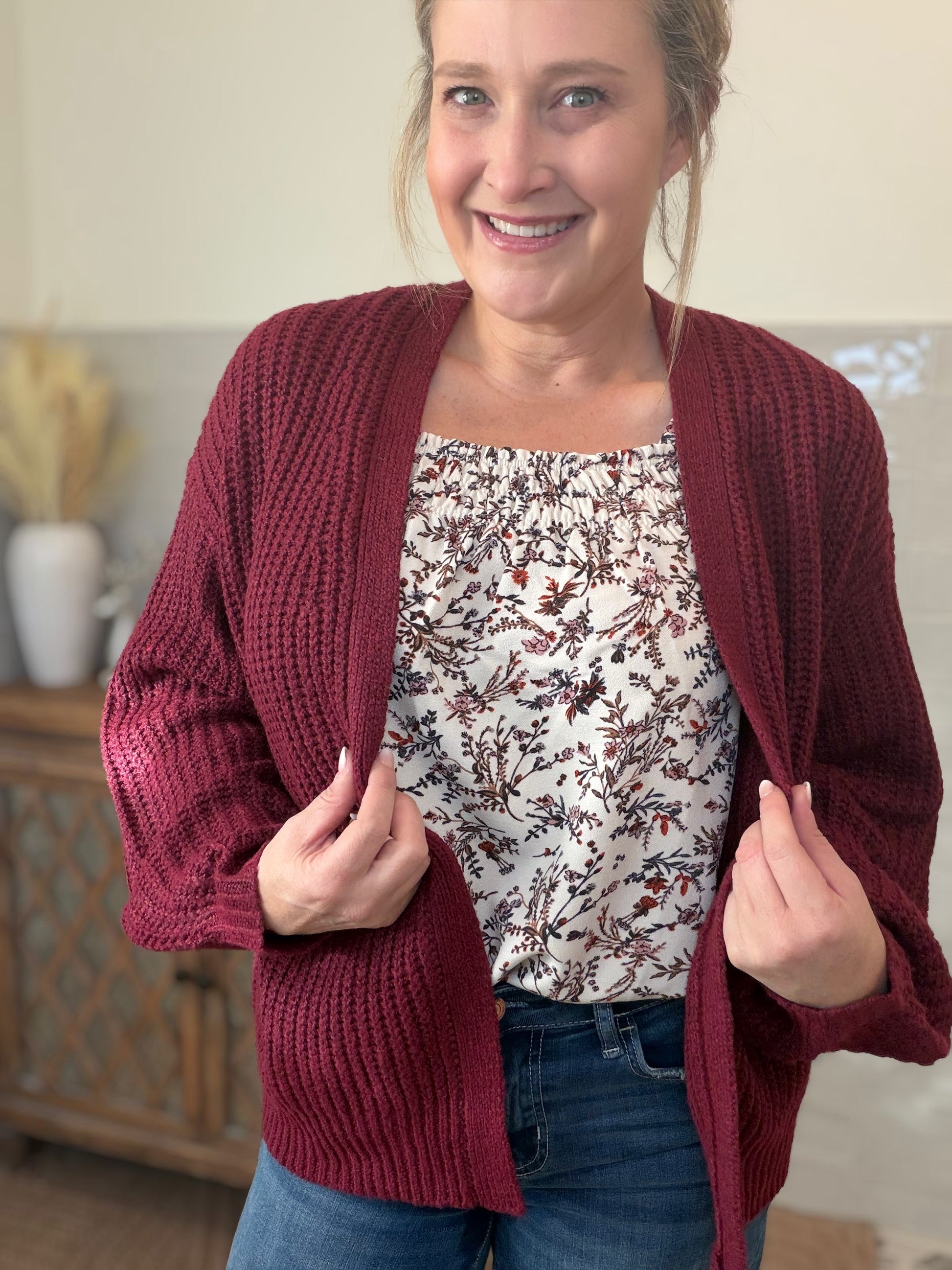 Wrap yourself in warmth and style with this stunning Burgundy Cardigan. The open-front design offers versatile layering possibilities, while voluminous balloon sleeves add a contemporary touch. Crafted from chunky sweater knit, this rich burgundy piece delivers cozy sophistication perfect for elevating any casual or dressed-up look.