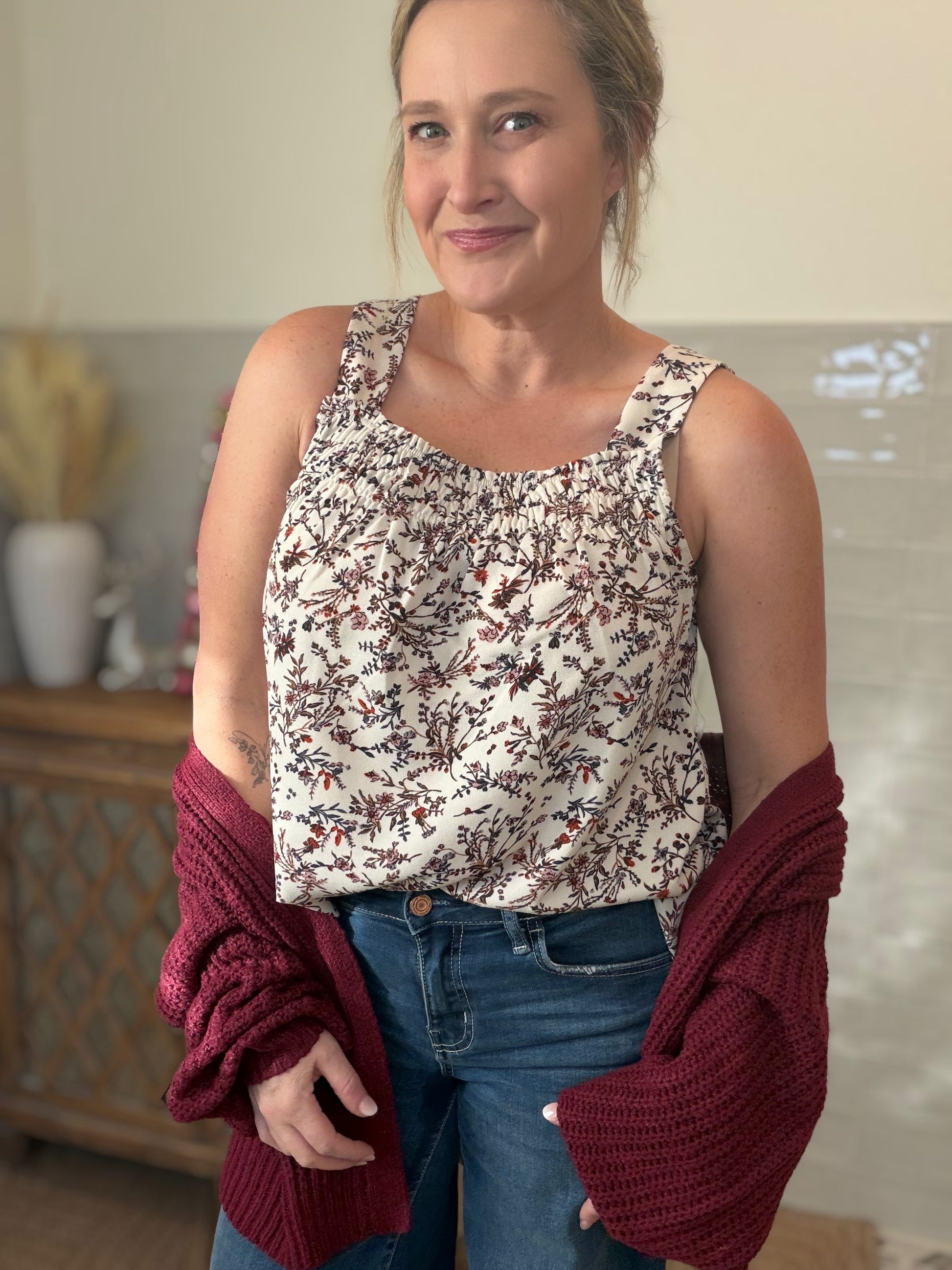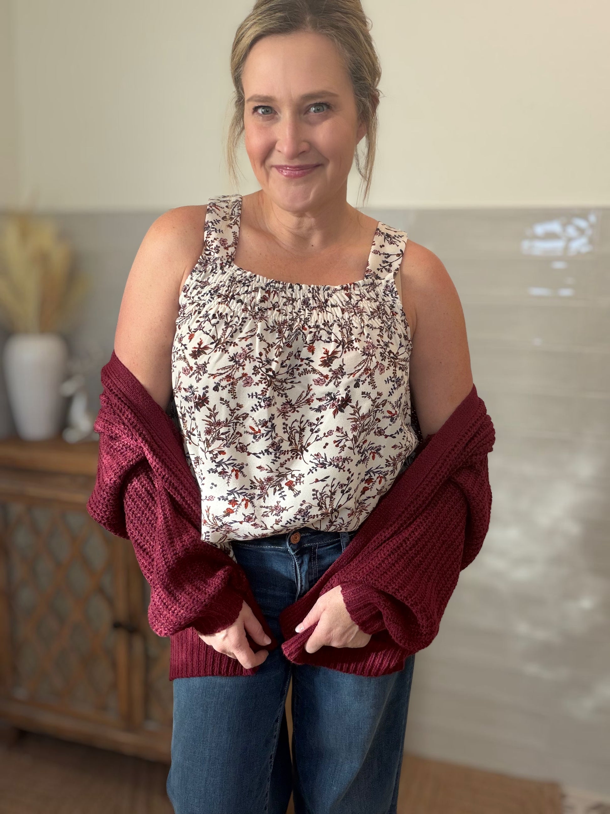 Embrace effortless elegance with this Floral Tank Top, designed to turn heads. The charming floral print is complemented by a flattering square neckline and supportive wide straps for all-day comfort. A delicate smocked chest detail adds texture and visual interest, making it the perfect standalone piece or ideal layering option with your favorite cardigan.
