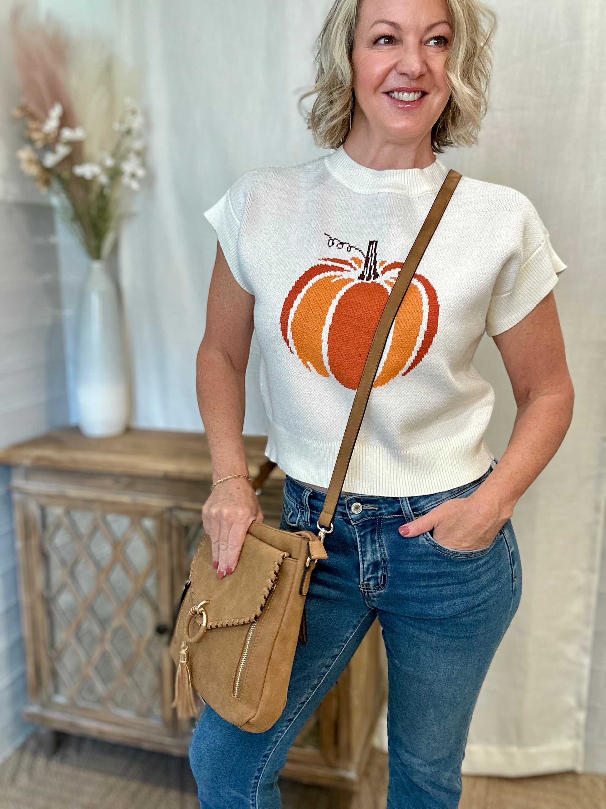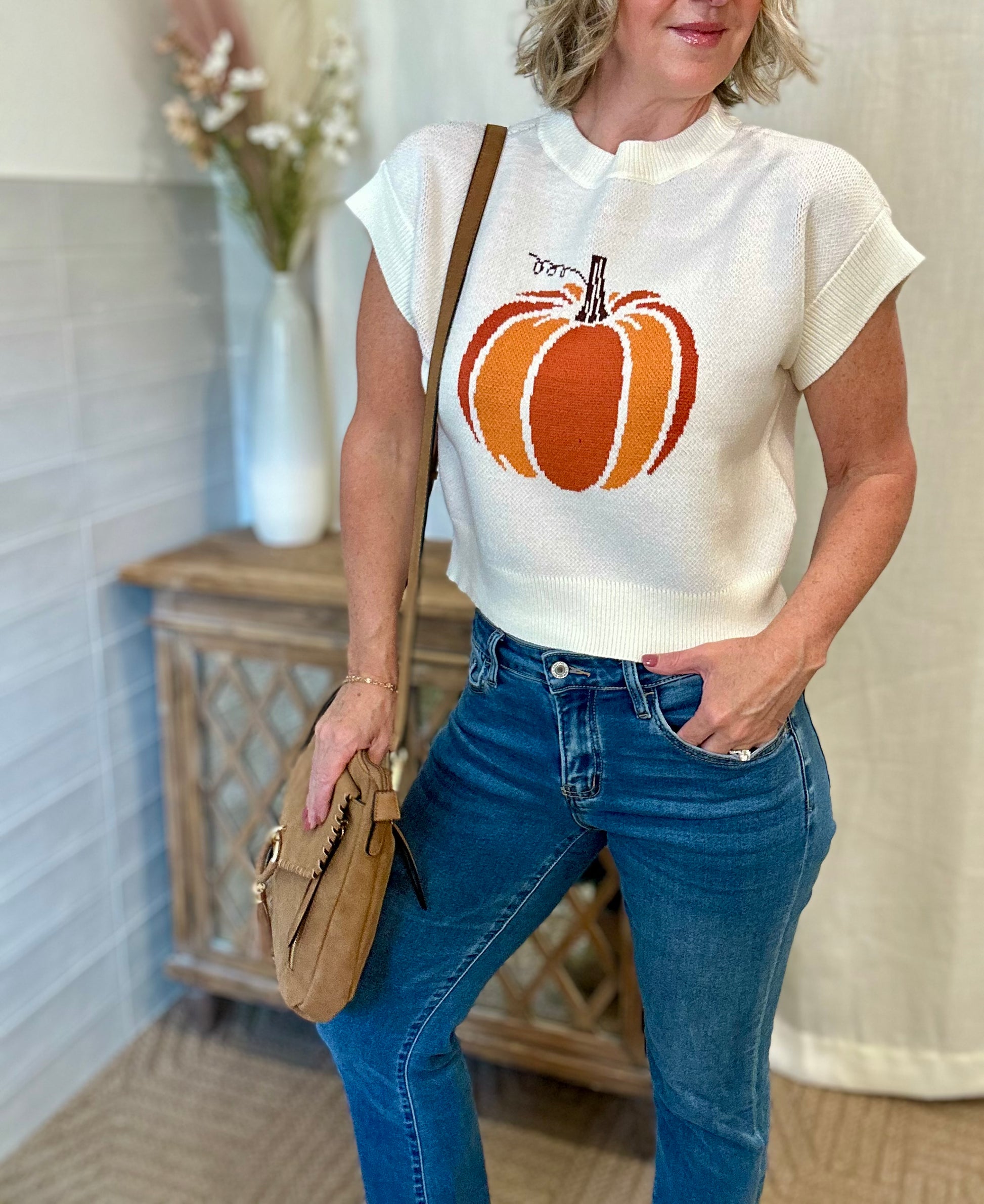 This medium-weight, semi-cropped sweater features a round neckline and short sleeves with a festive Halloween or Fall design. Crafted for softness and comfort, it’s an ideal top to elevate your seasonal wardrobe.