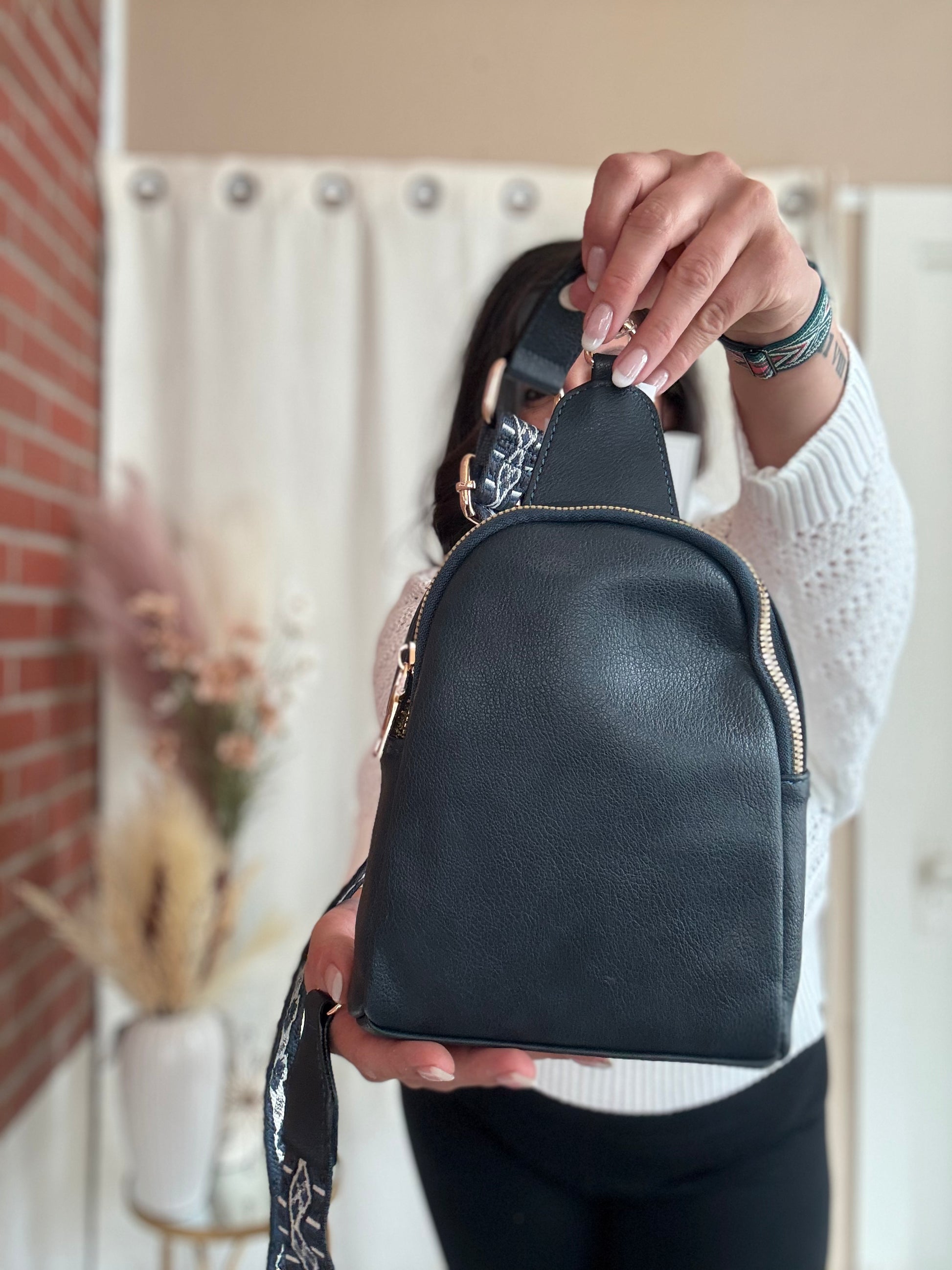 Take your style to the next level with the Ellen Sling Handbag! This playful guitar strap sling bag features a zip closure and adjustable/removable strap for easy customization. Perfect for fun and carefree vacation vibes!