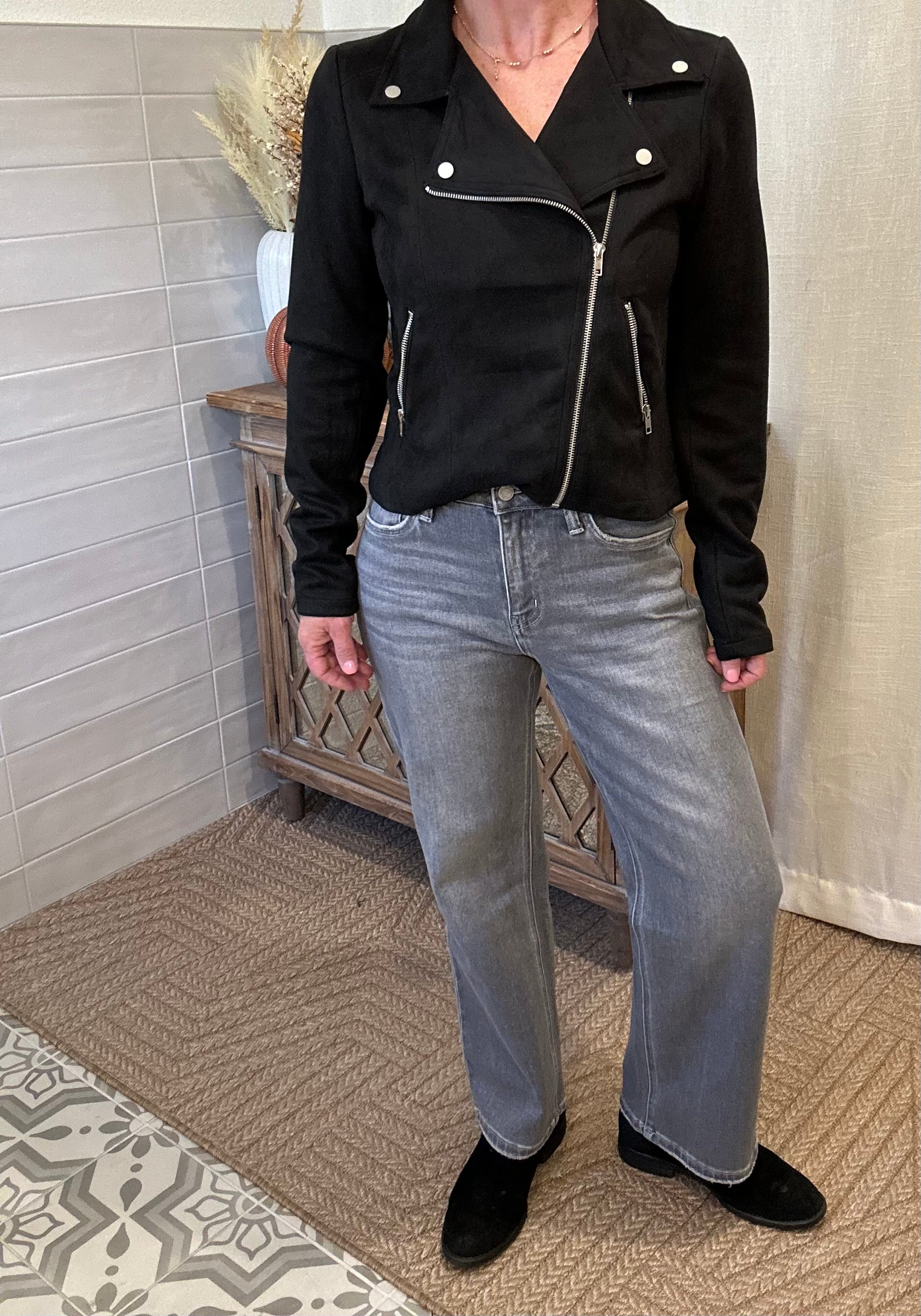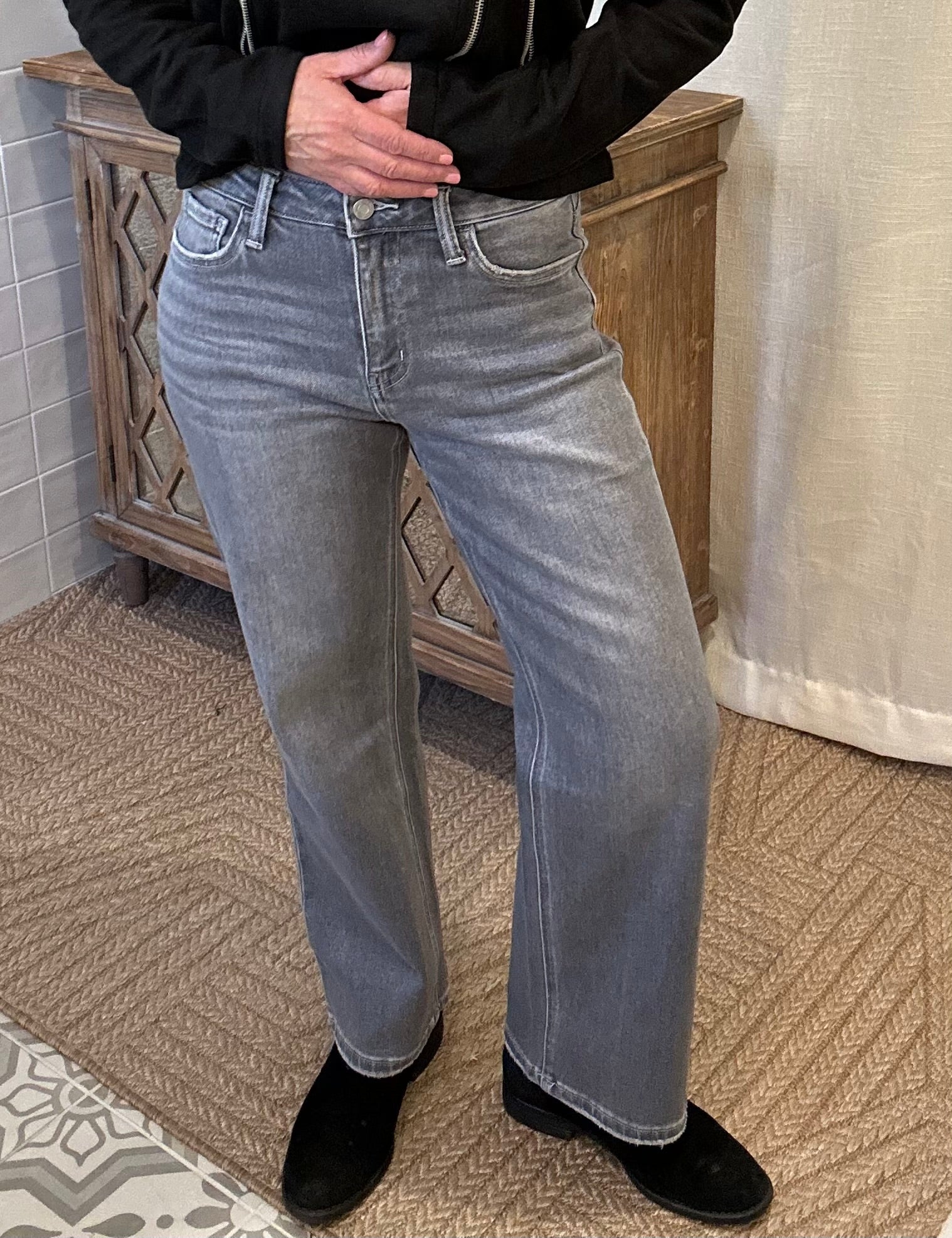 Make a bold statement with these high-rise ankle jeans that balance modern silhouette with timeless appeal. The comfort stretch denim moves with you throughout your day, while the elevated high-rise waist creates a flattering, elongated line. A slim wide-leg cut offers contemporary volume without sacrificing shape, finished with a clean hem at the ankle. Versatile enough to transition seamlessly from casual to refined looks.