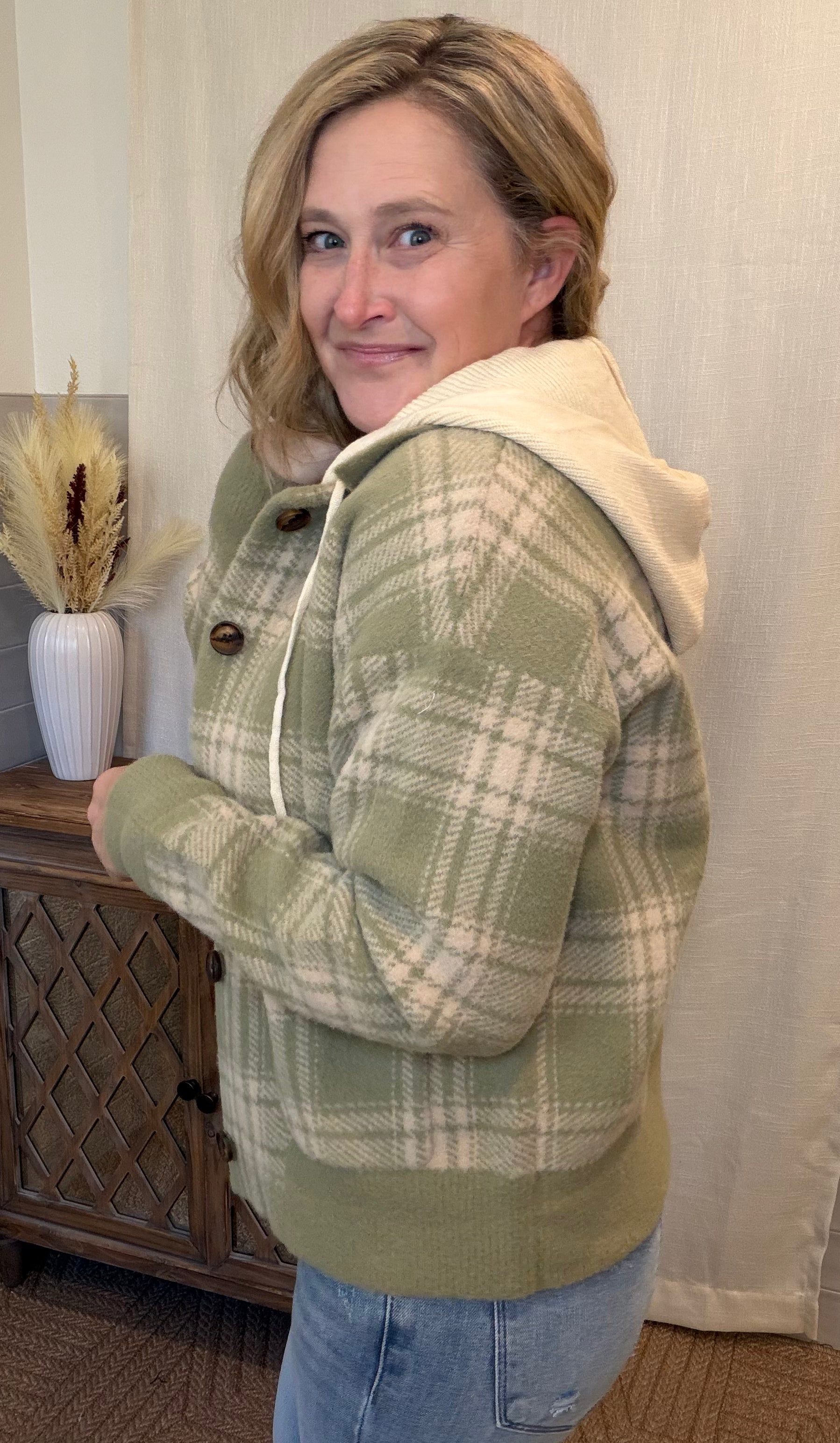 Experience cozy style with this sage sweater jacket, featuring a soft fabric, a button-down front, a detachable checked hoodie, and a chic collar for versatile wear.