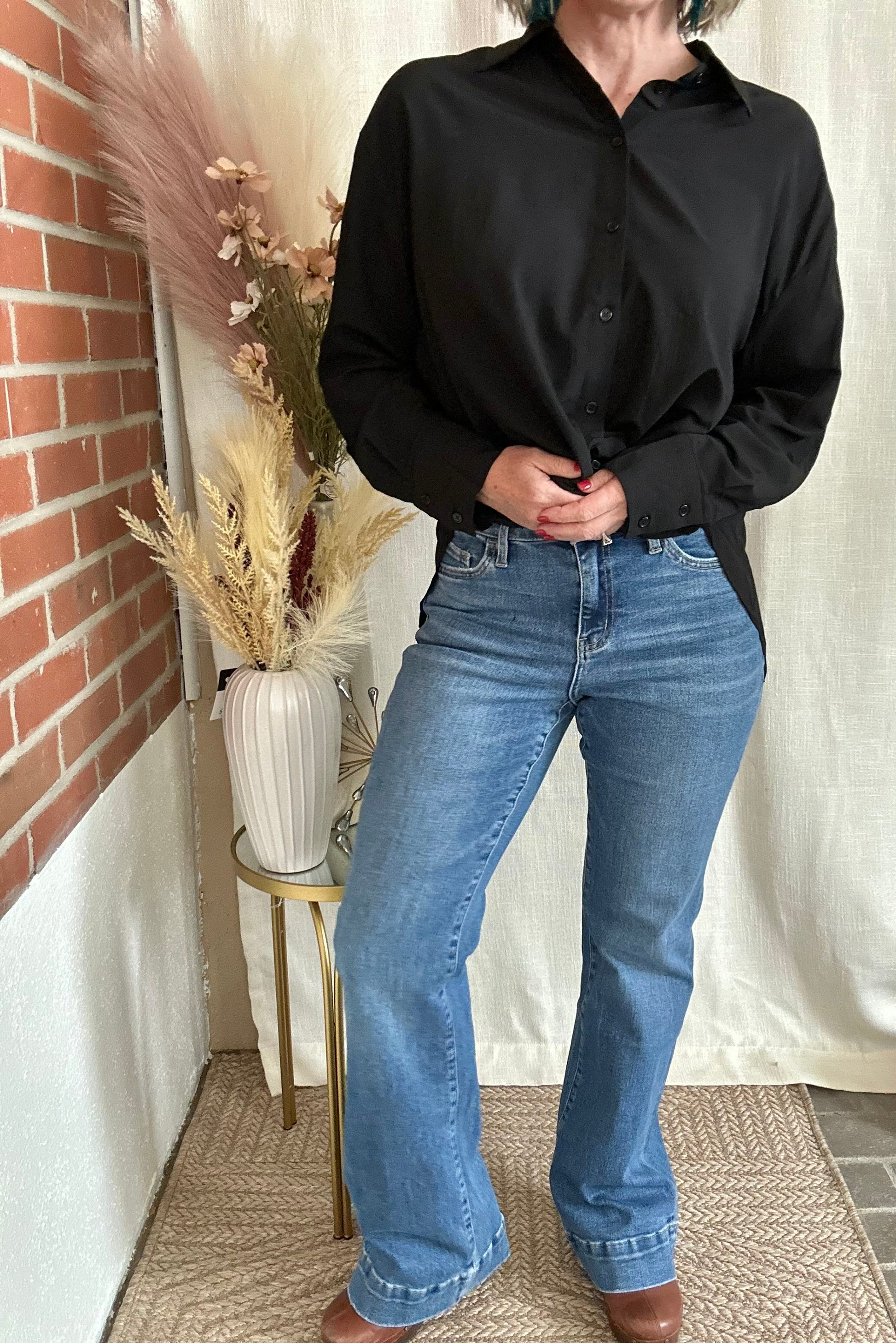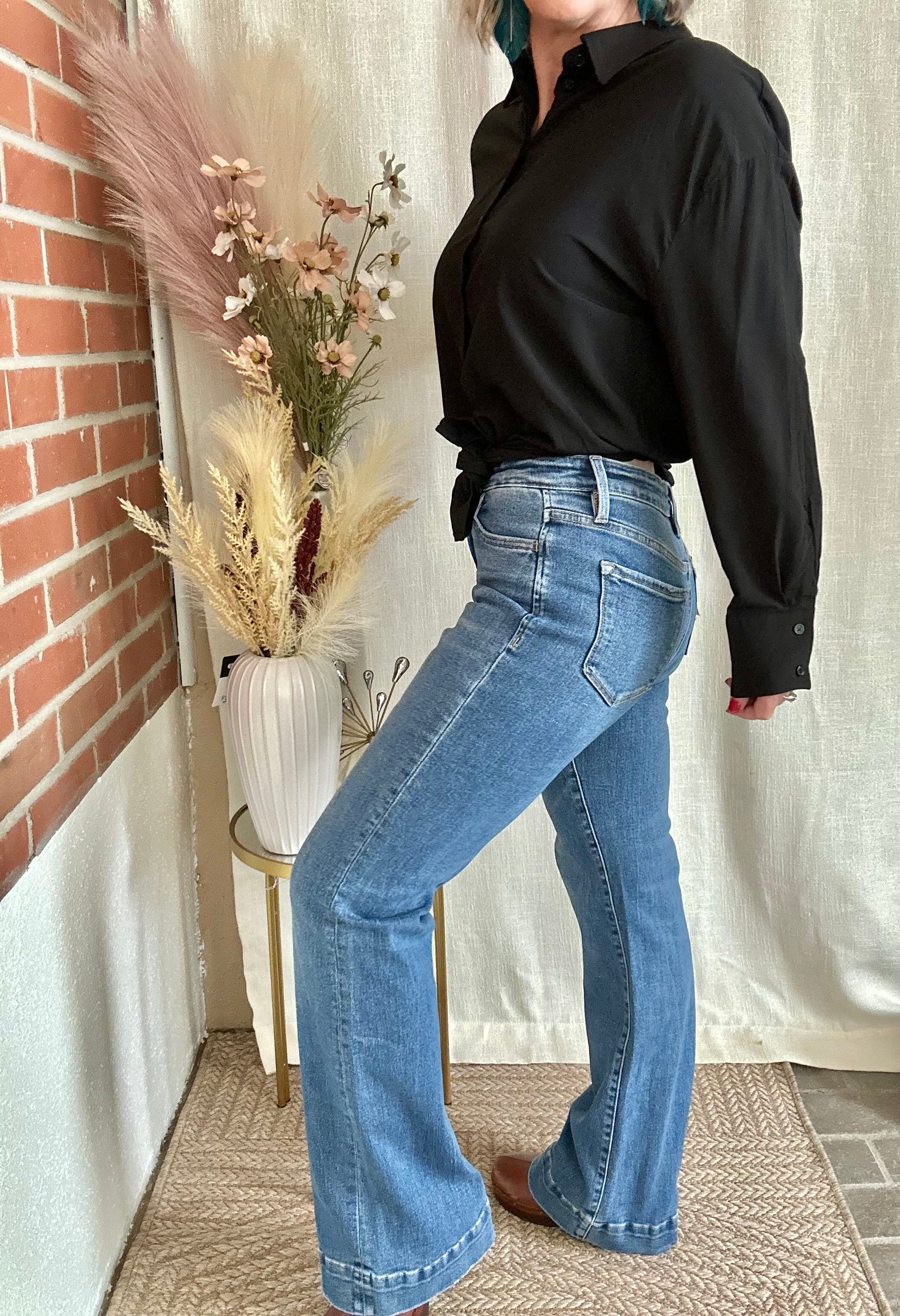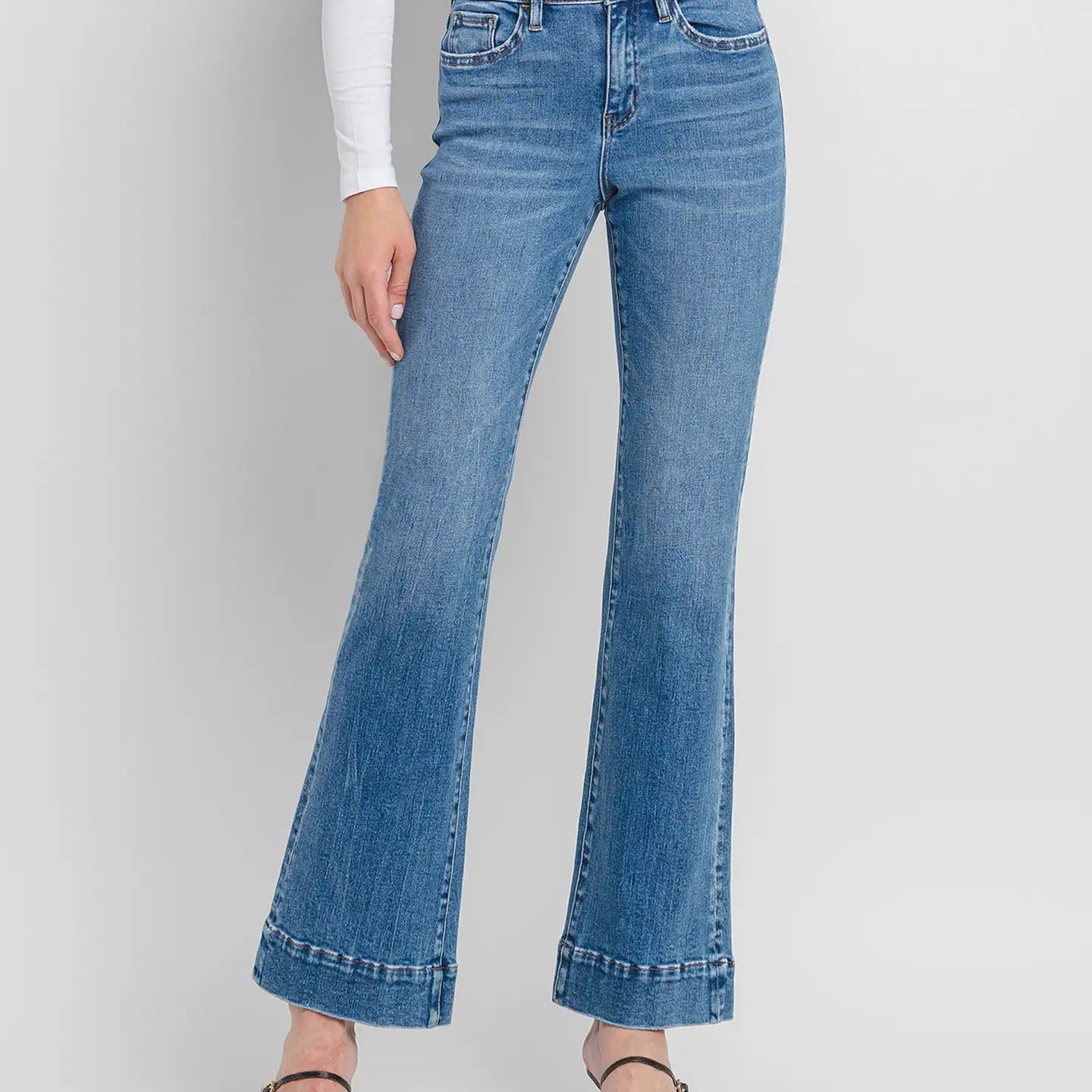 Experience comfort and style in our High Rise Trouser Relaxed Jeans. Made with comfortable stretch denim and a high rise waist, these full length jeans feature a trendy trouser hem and relaxed flare fit. Elevate your wardrobe with these flattering and versatile jeans!