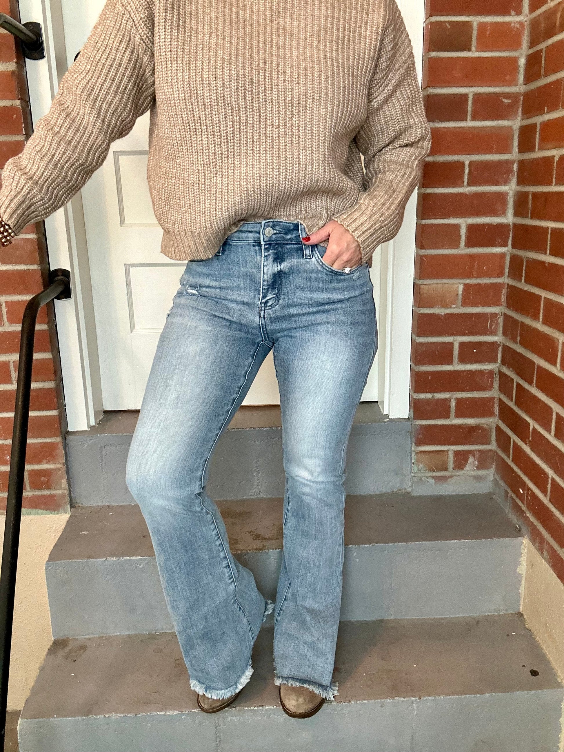 Get ready to rock and roll in these 10" high rise flare jeans! Made with comfortable stretch denim and featuring distressed details, frayed hems, and a full length fit, these jeans will be your new faves.