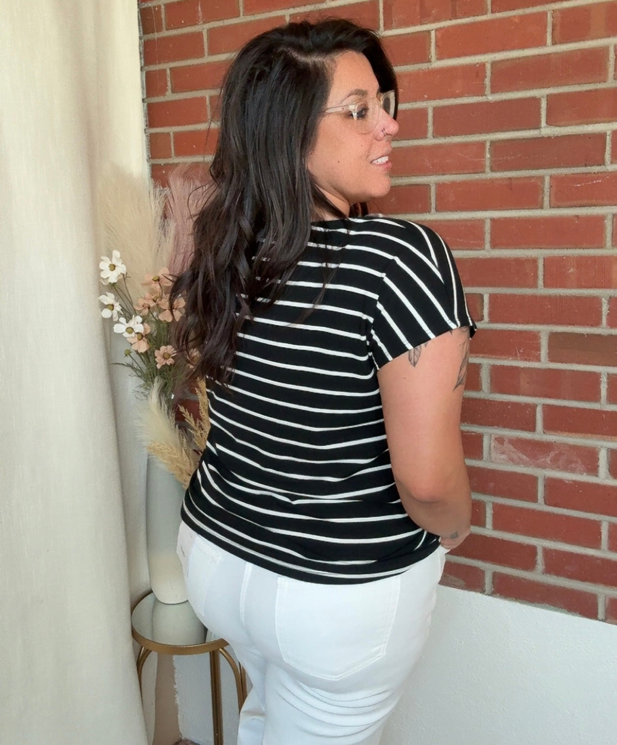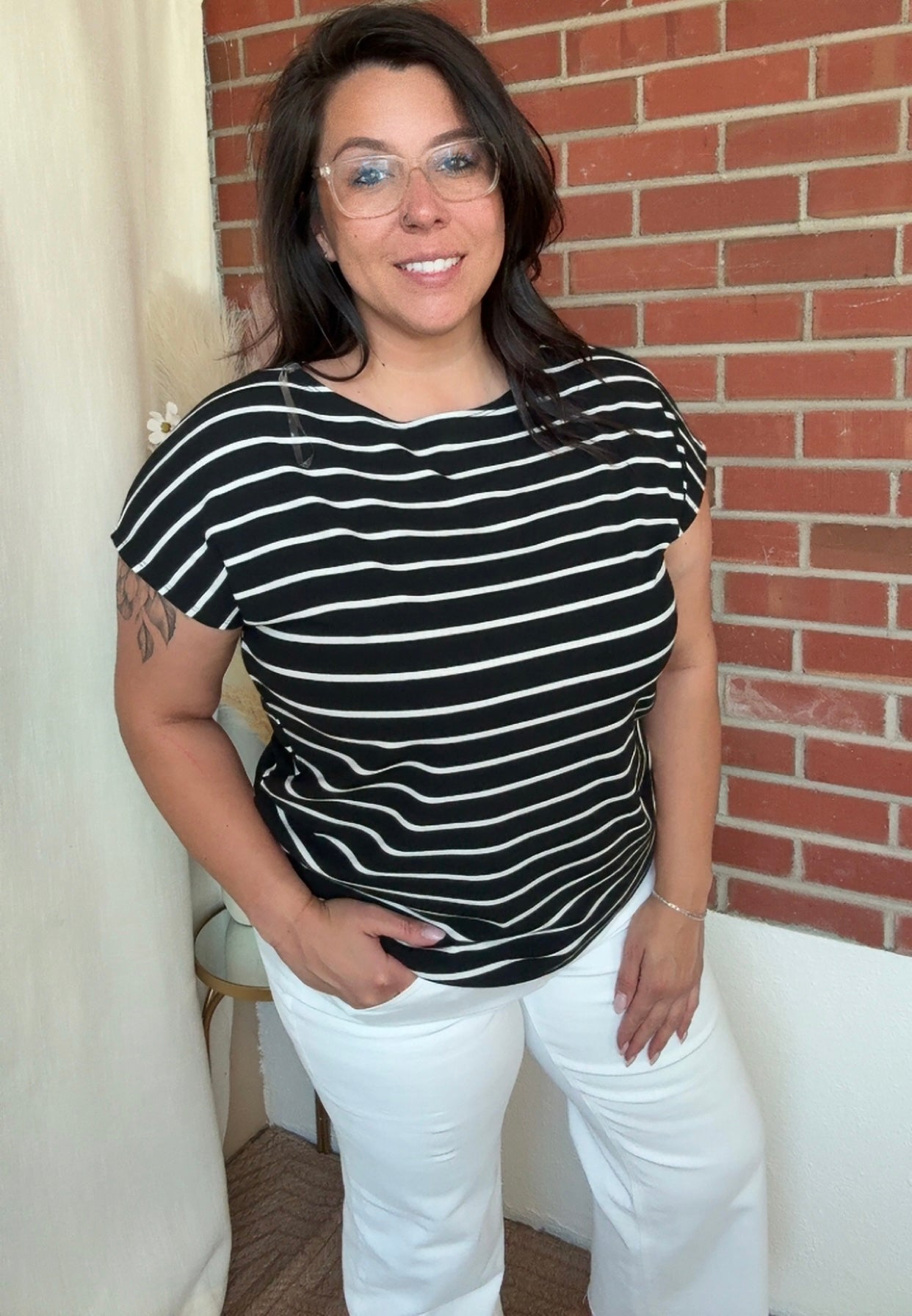 Elevate your wardrobe with our Black and White Stripe Top! Featuring a stylish boat neckline and short sleeves, this baby ribbed top adds a touch of sophistication to any outfit. Lightweight and comfortable, it's perfect for any occasion.
