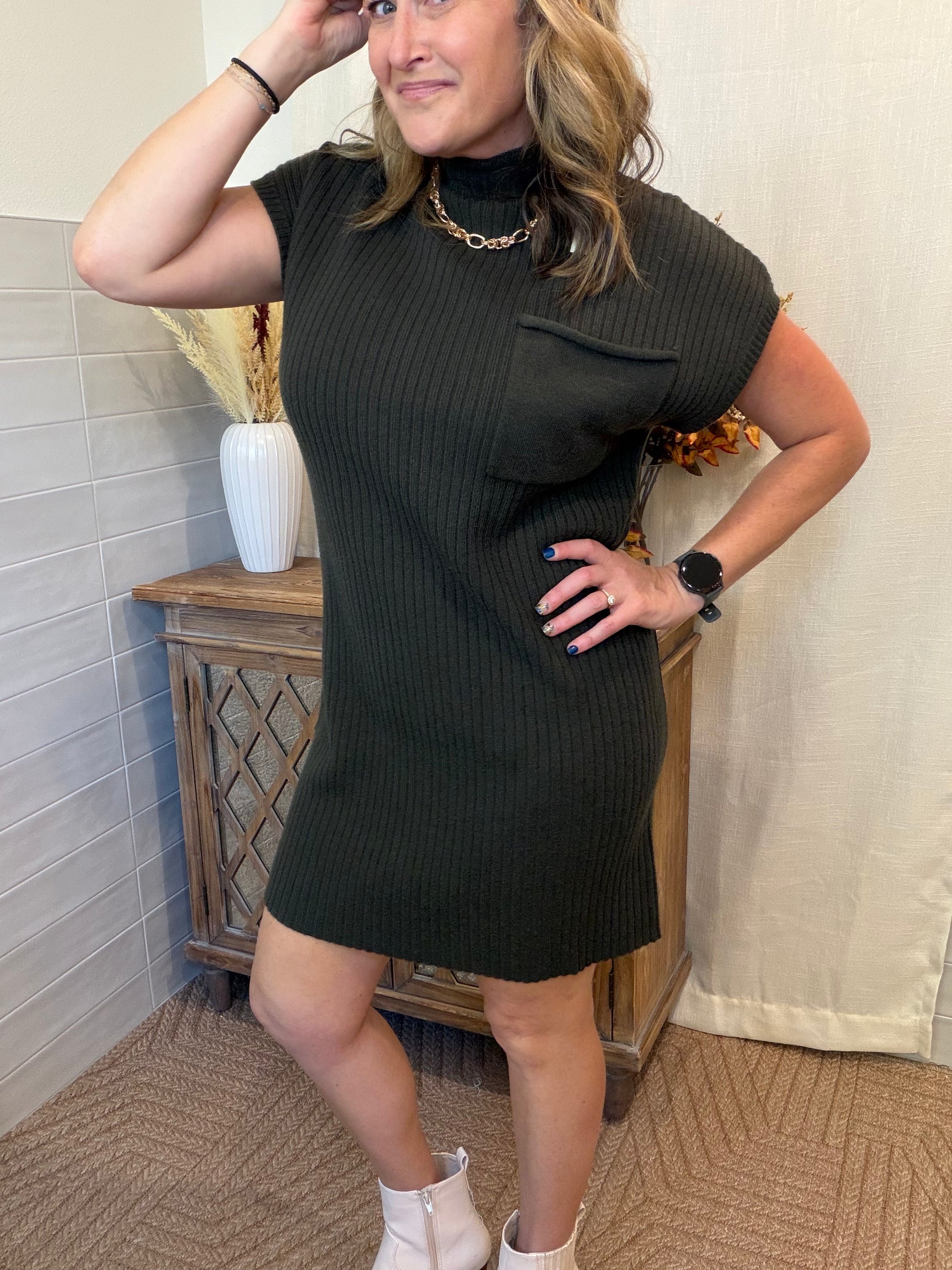 This sweater dress features a relaxed drop shoulder silhouette, a cozy mock neckline, and a convenient front pocket, effortlessly combining comfort with practical style.