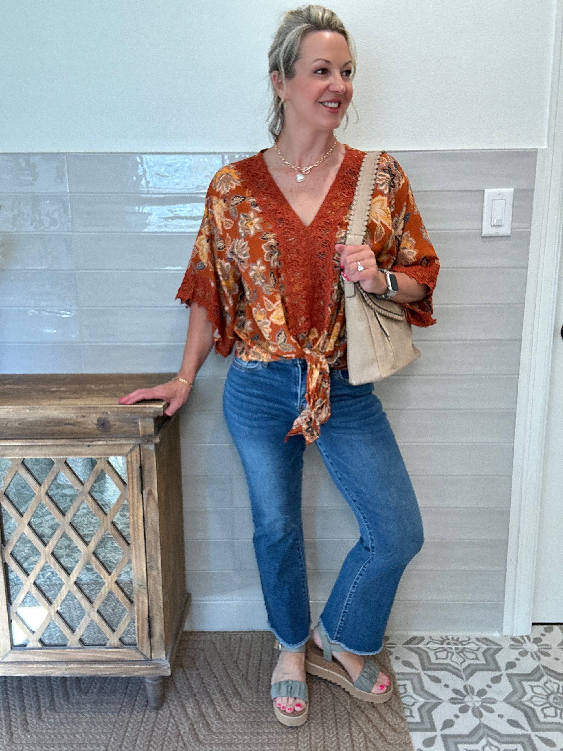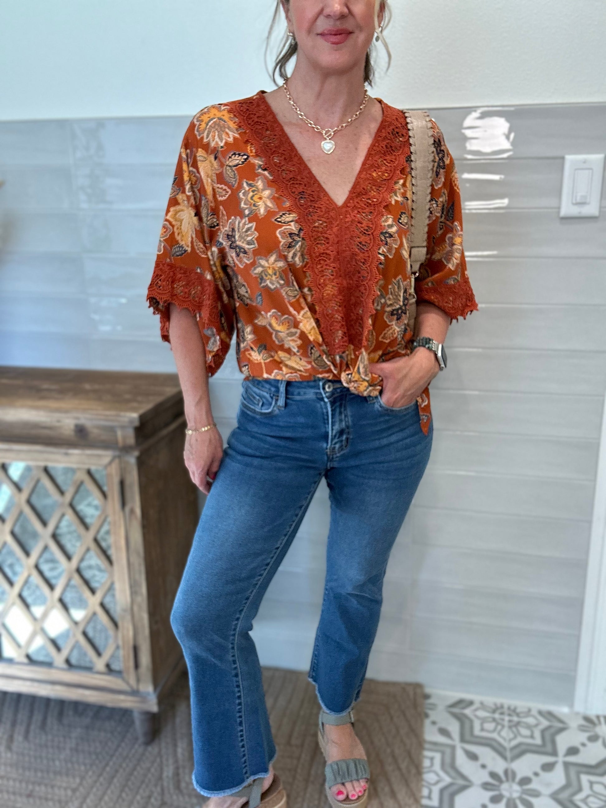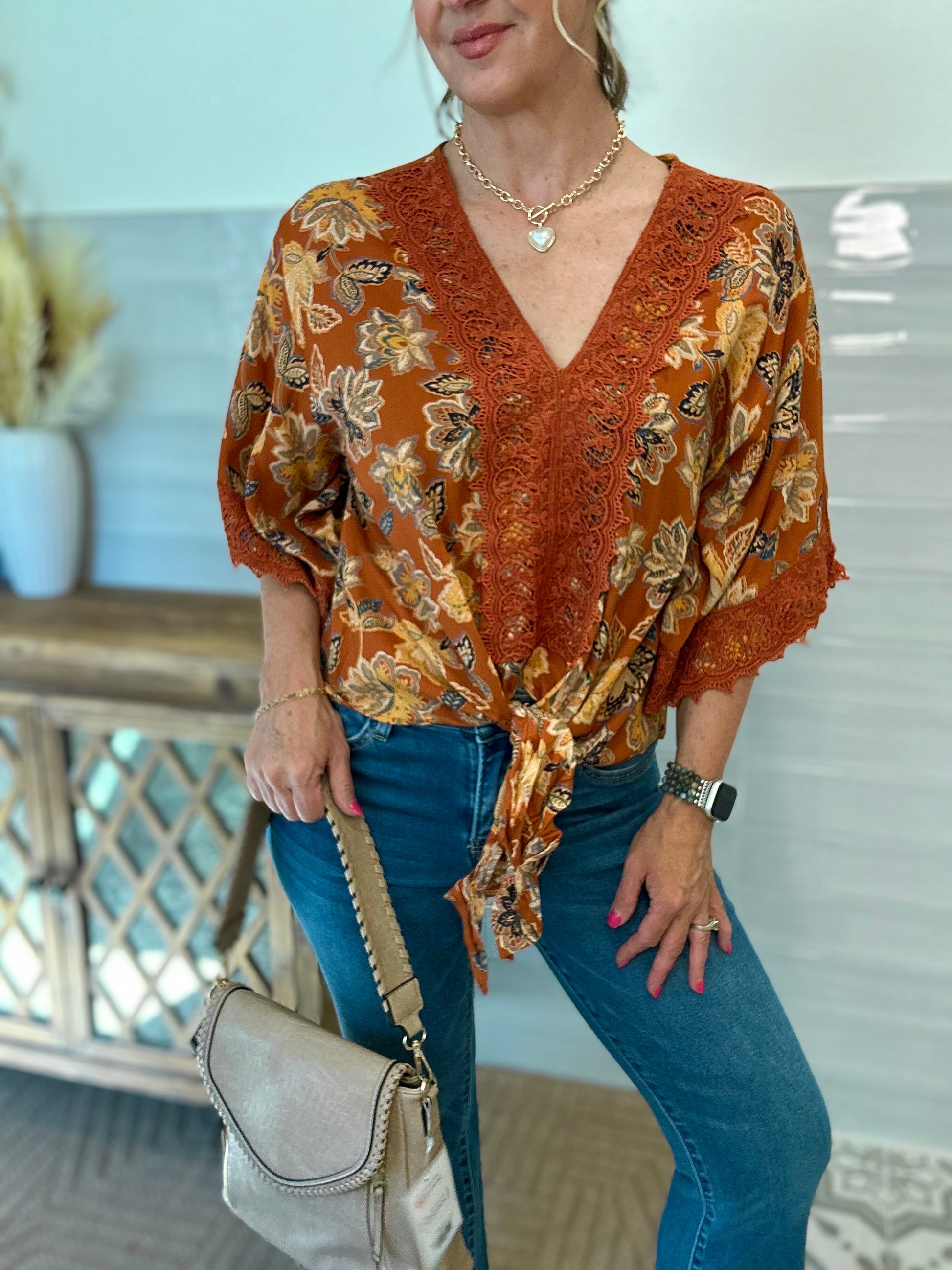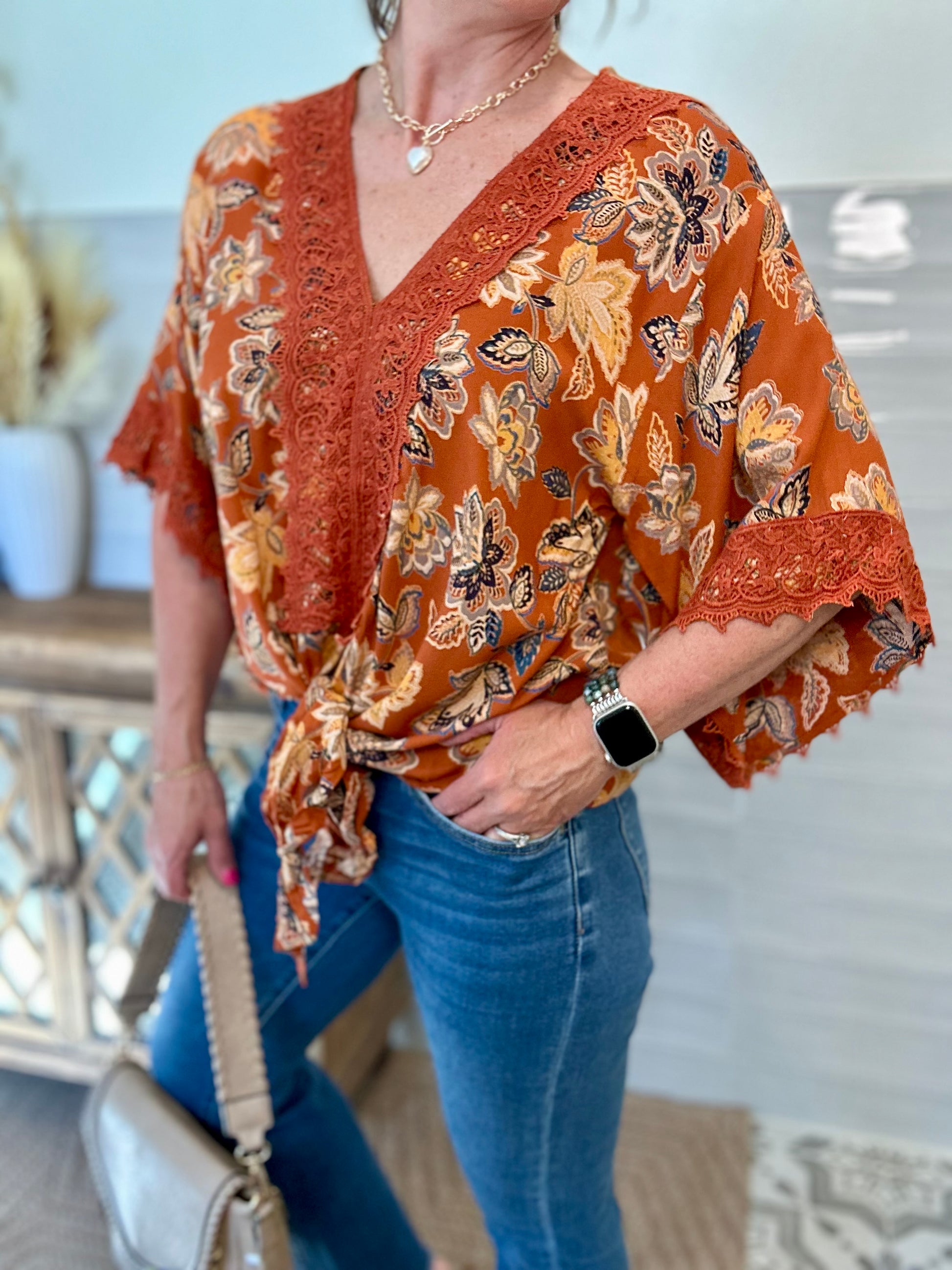 This printed tie-front blouse features burnt orange paired with cream and navy lace trim, creating a stylish and playful look with its charming tie detail at the front.