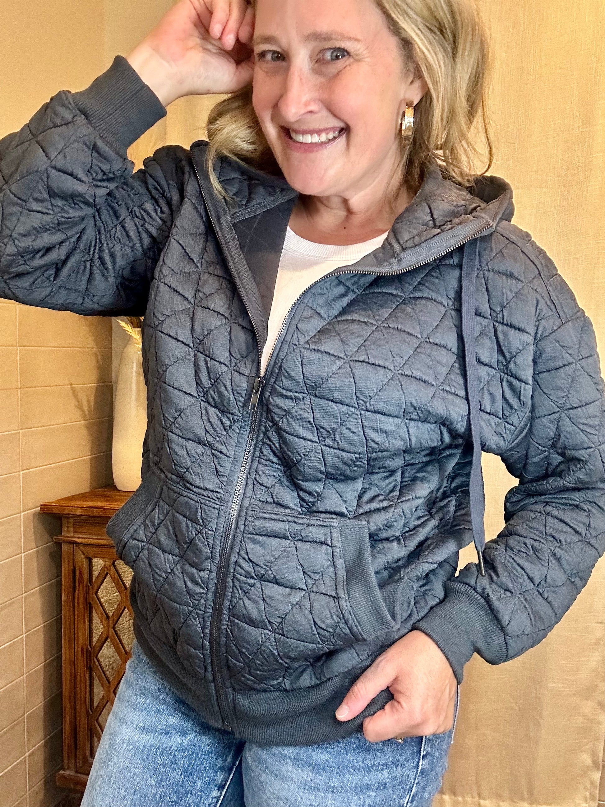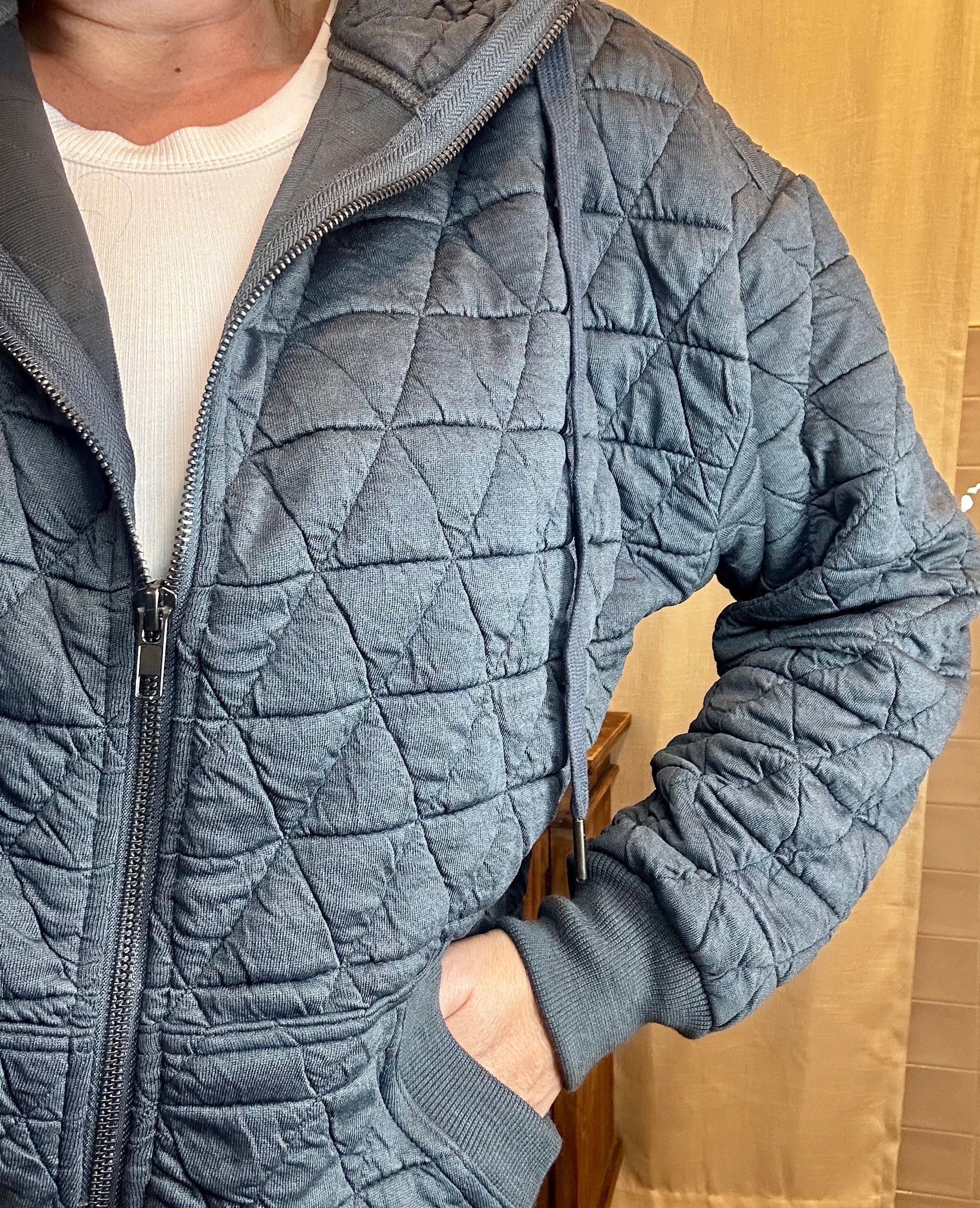 Discover the ideal mix of style and practicality in this gun metal quilted knit hoodie, featuring a convenient zip-up front and a spacious kangaroo pocket to keep your essentials close.