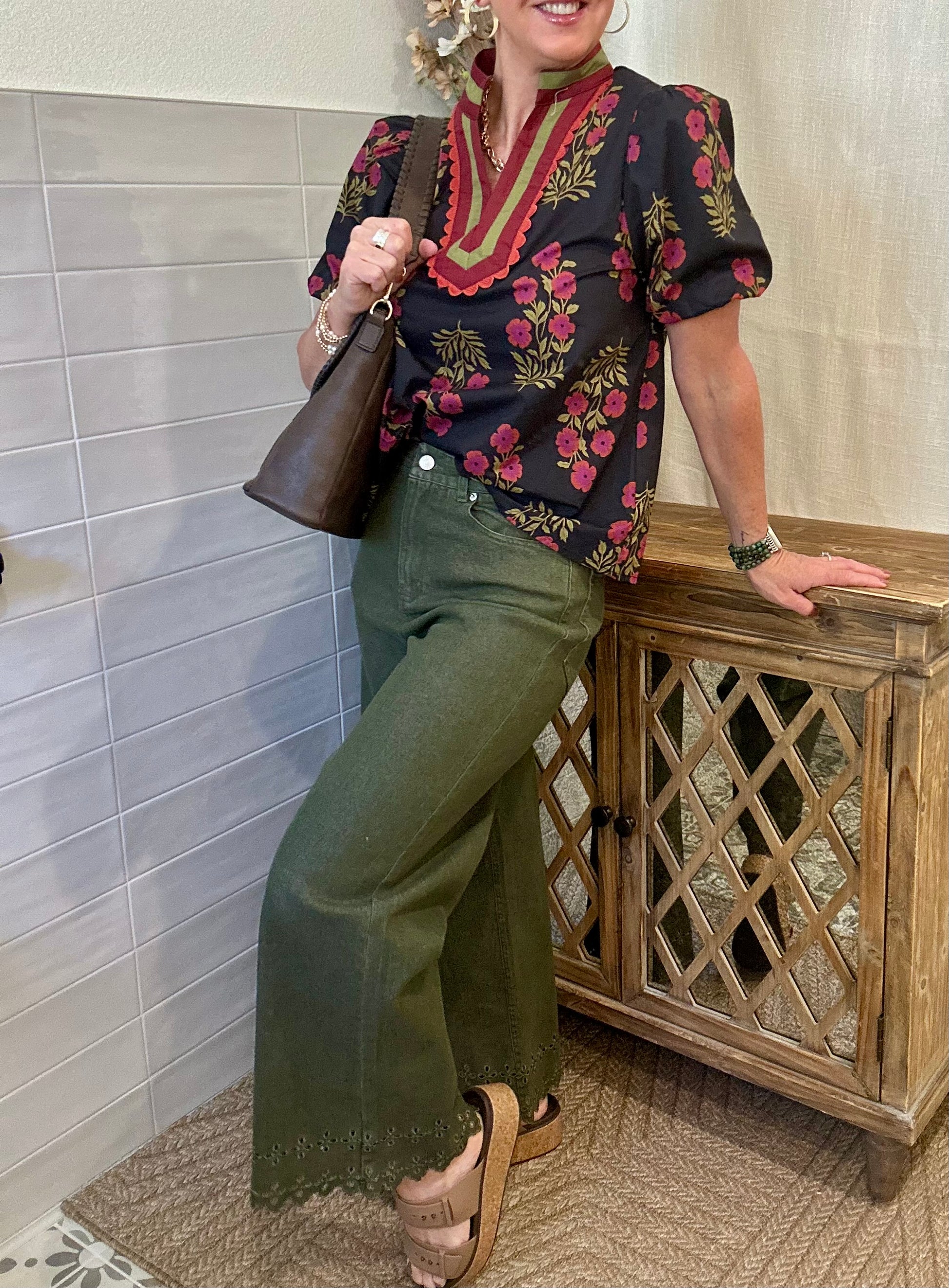 These high-waist, ankle-length pants showcase a delicate floral embroidery along the hem for an elegant touch. They feature a timeless button fly with zipper closure and traditional jean pockets for added convenience. Made from lightweight woven fabric, they are unlined and non-sheer, offering comfortable wear with style.