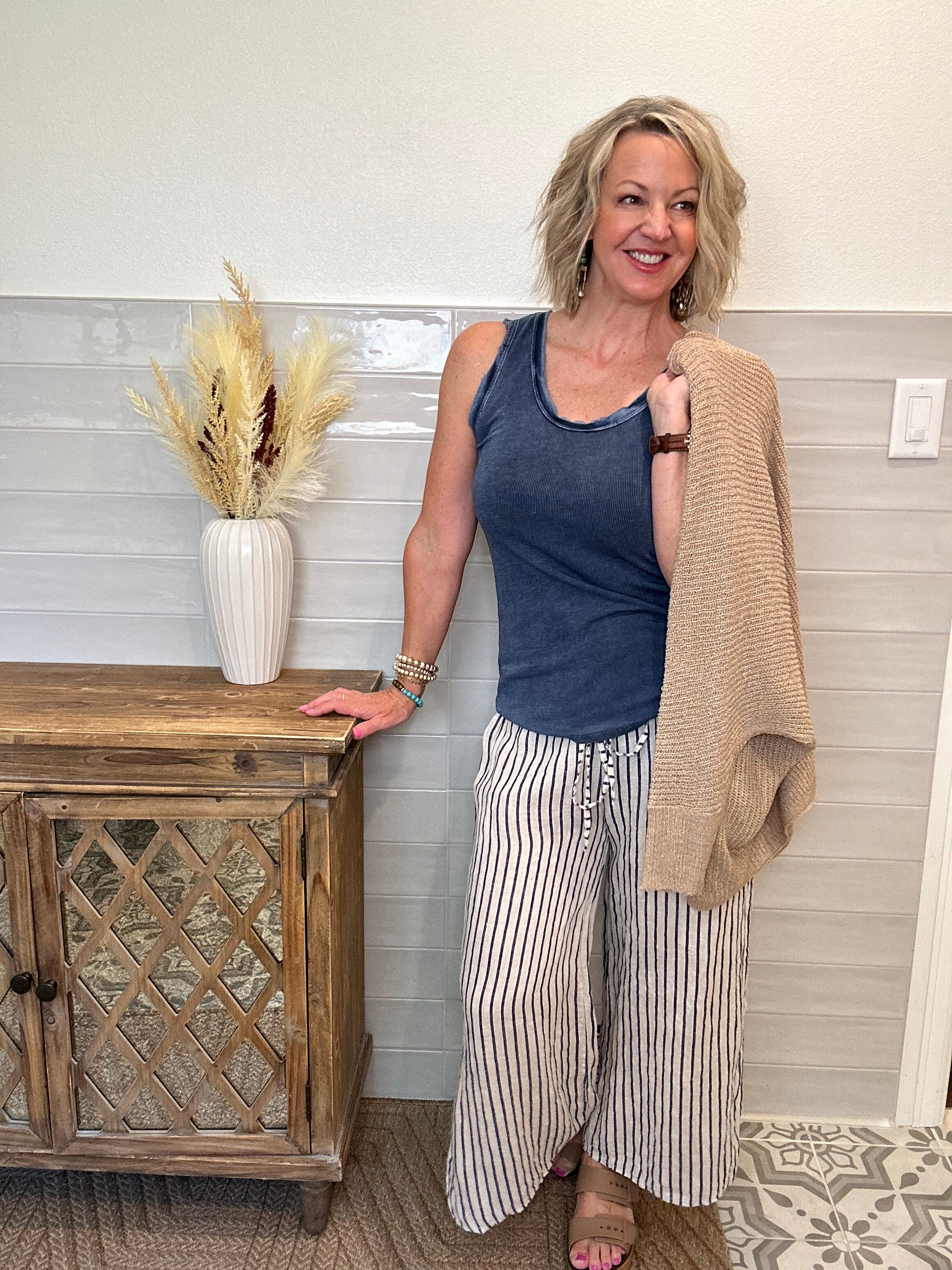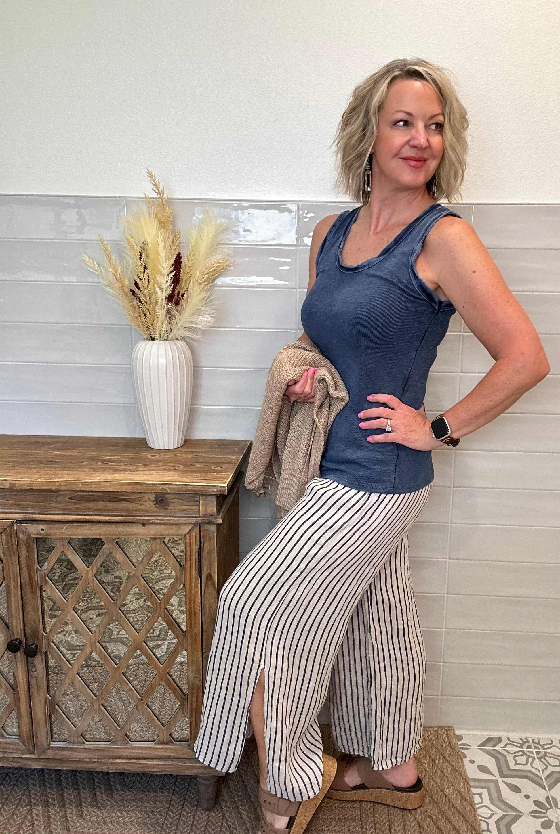 Enjoy comfort and style with these Striped Linen Capri Pants, featuring a convenient drawstring waist and stylish side slits for added breathability. Light weight and non lined