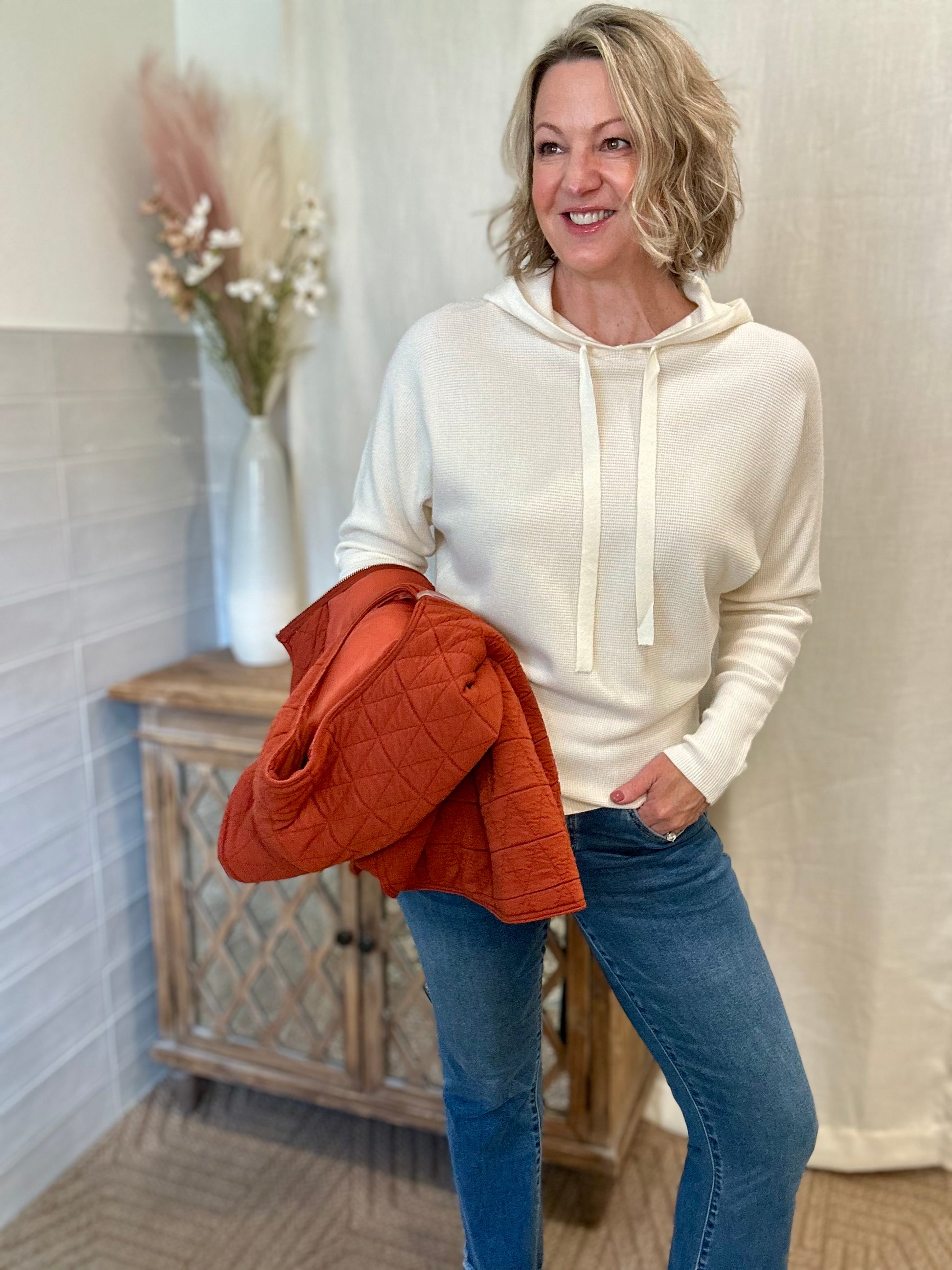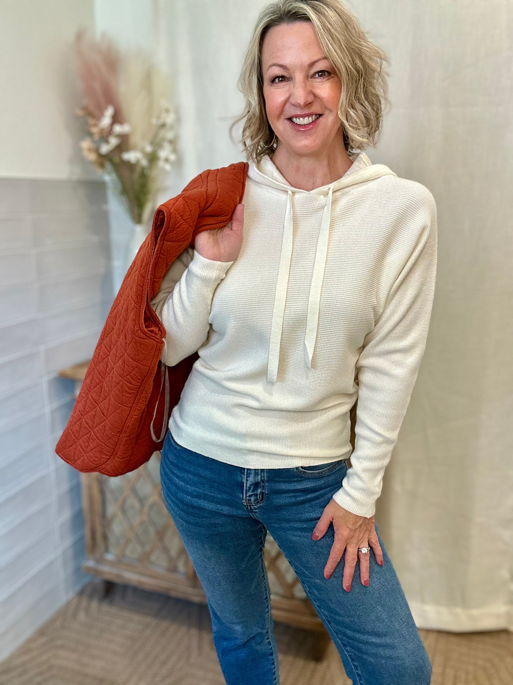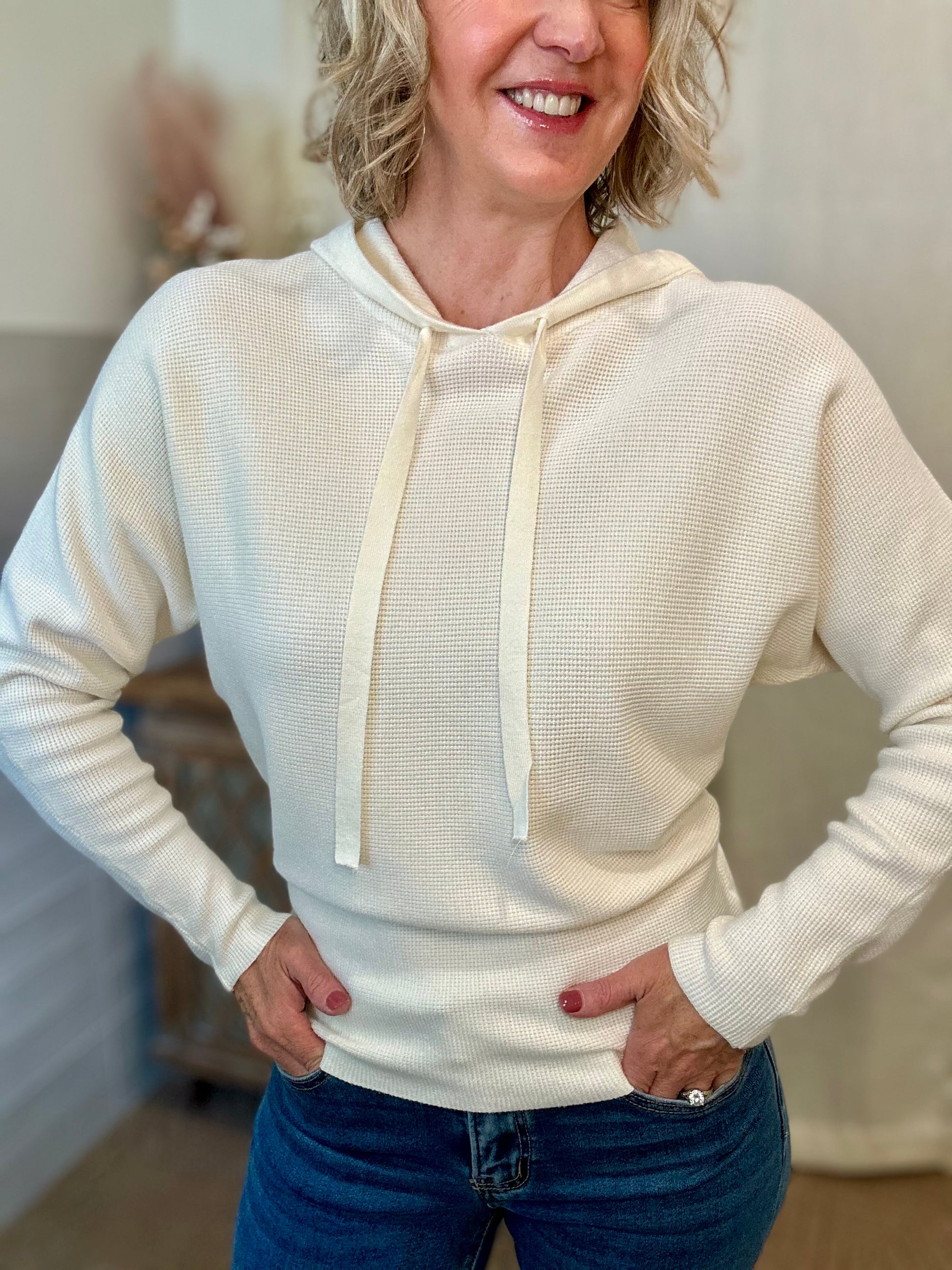 Experience cozy comfort with this ivory pullover hoodie featuring a delicate mini waffle texture and relaxed dolman sleeves. Crafted to be soft and stretchy, it moves with you while keeping you warm and stylish.
