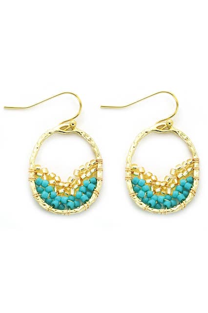 Fall in love with our stunning Slive Turquoise Earrings, featuring 1 1/4 inches of golden hammered ovals adorned with beautiful turquoise beads. Don't miss your chance to add this unique touch of elegance to your jewelry collection!