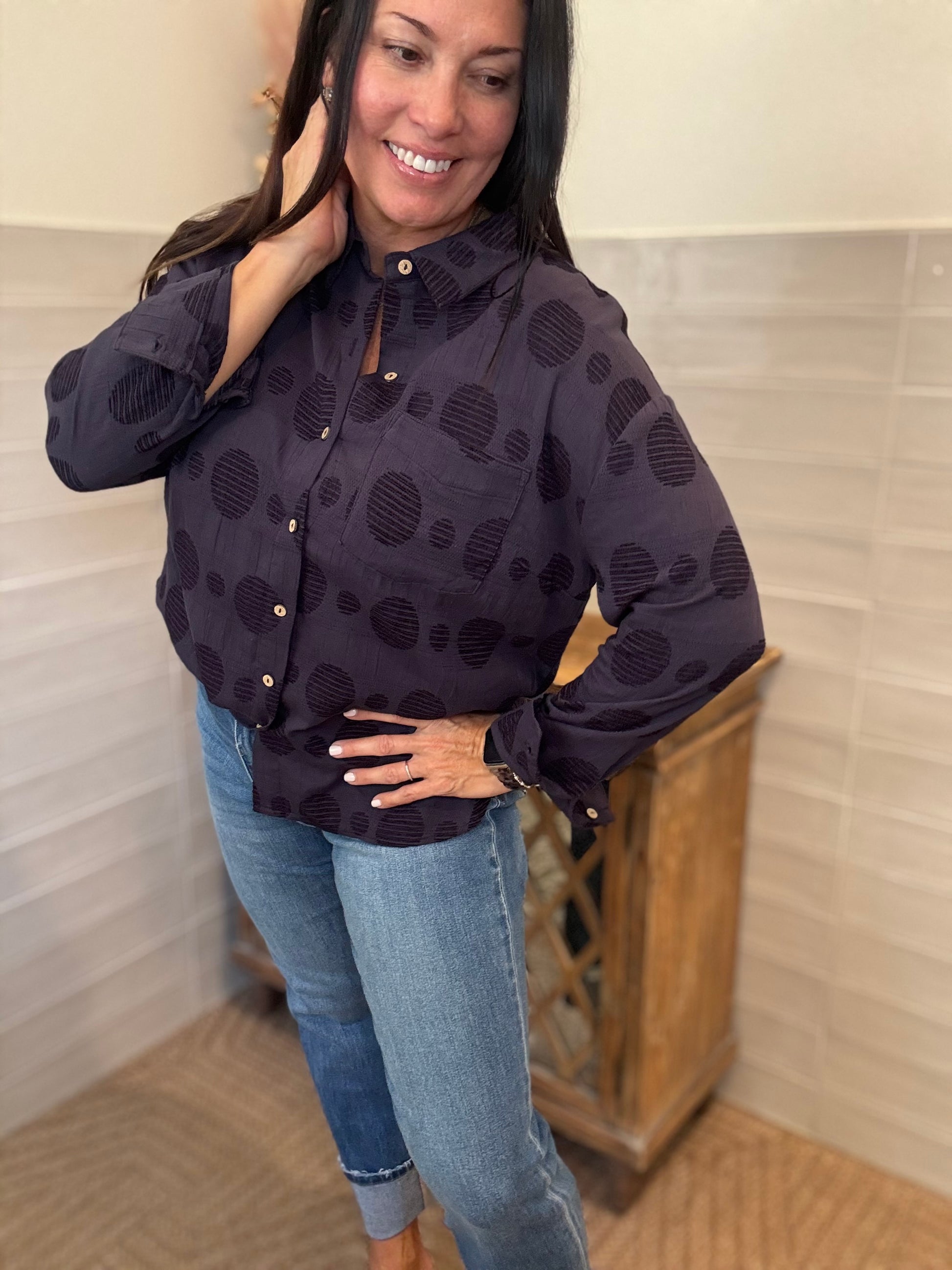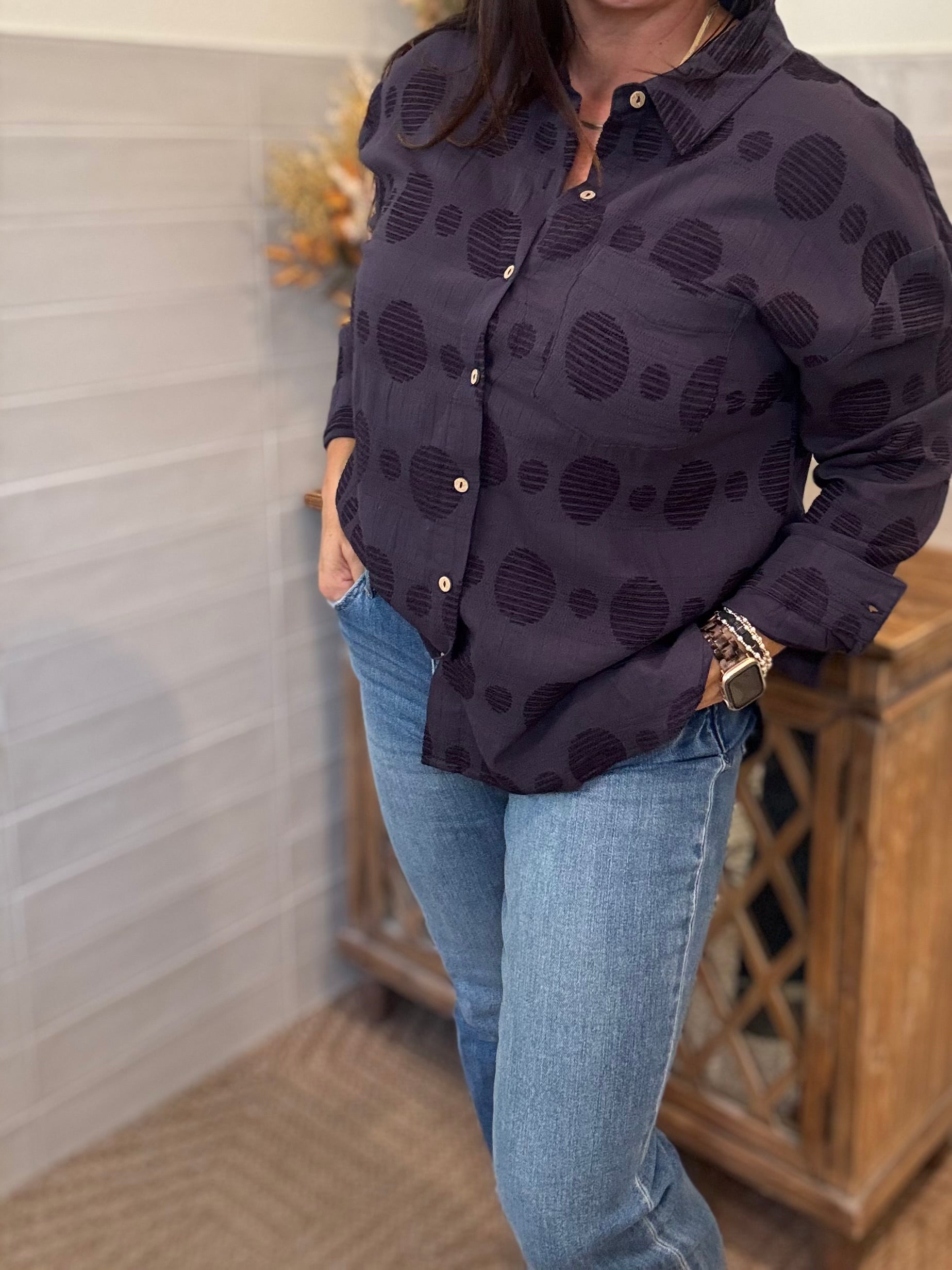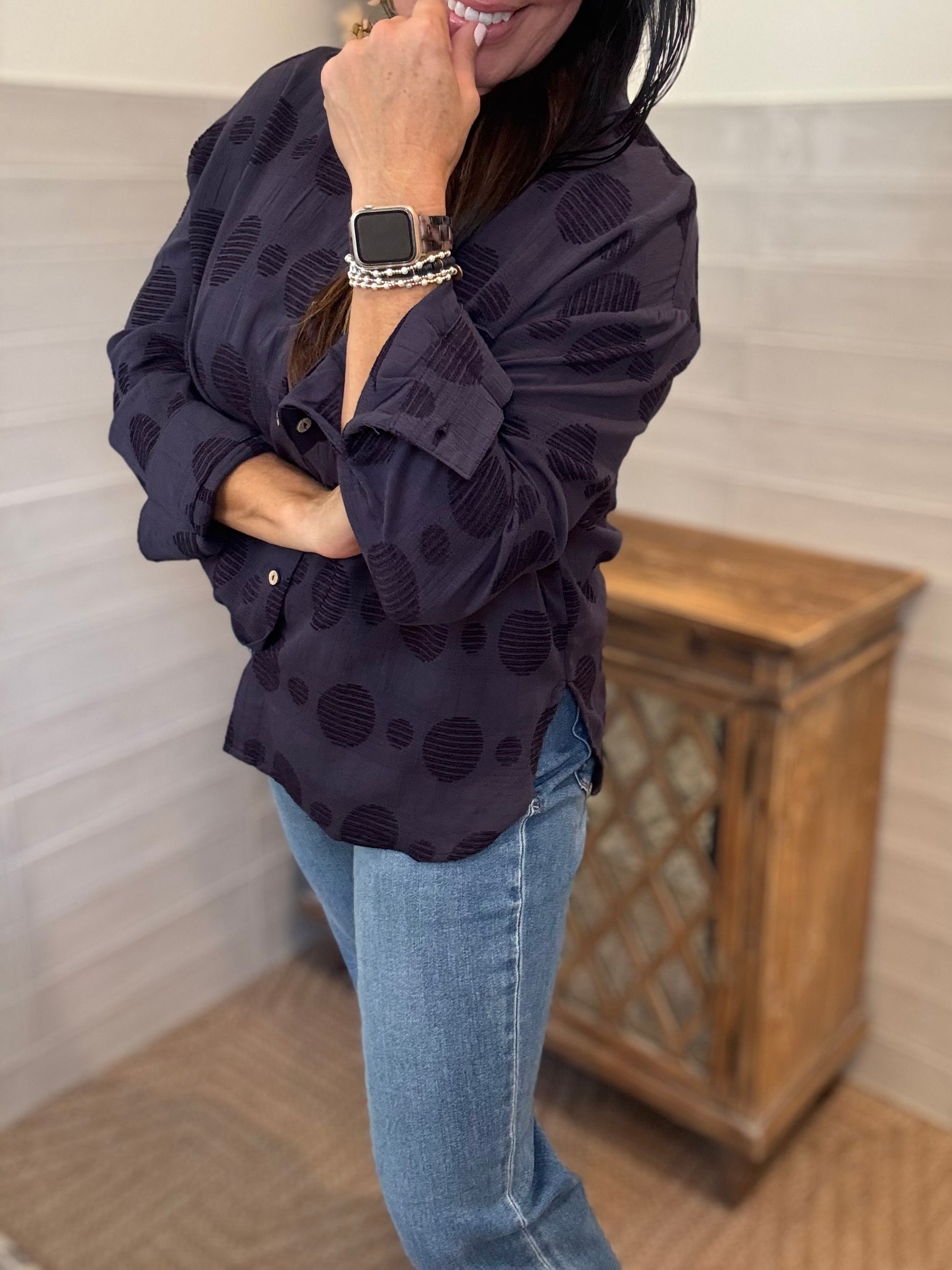 Elevate your wardrobe with this Navy Swiss Dot Blouse, featuring delicate Swiss dot jacquard fabric and a classic button-down design. Crafted from jacquard material, this lightweight shirt offers subtle texture without lining, perfect for a polished yet breathable look.
