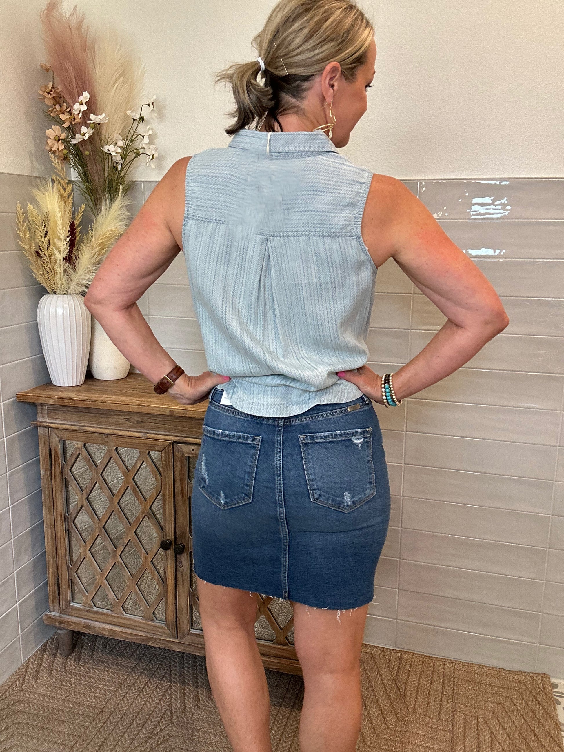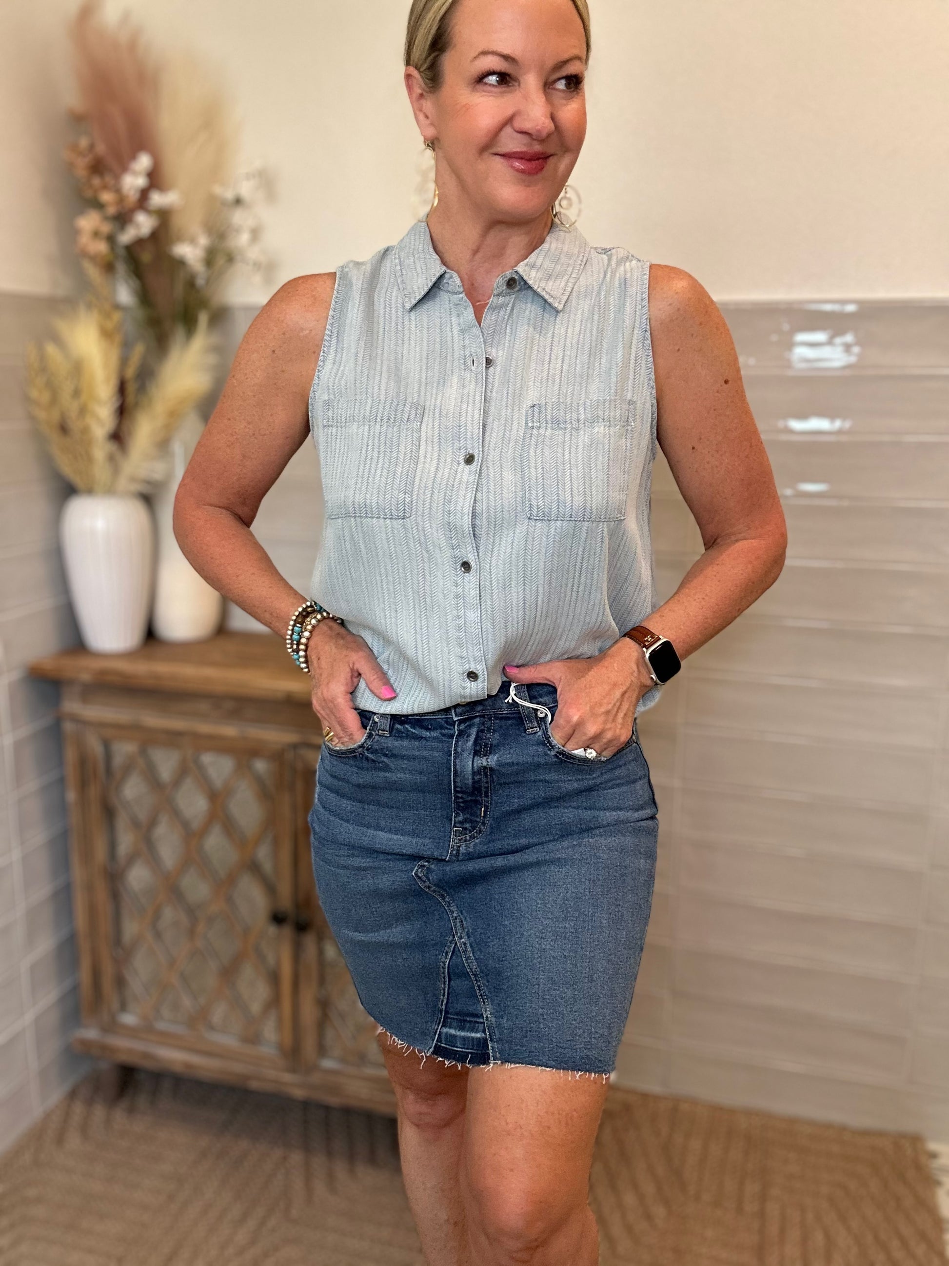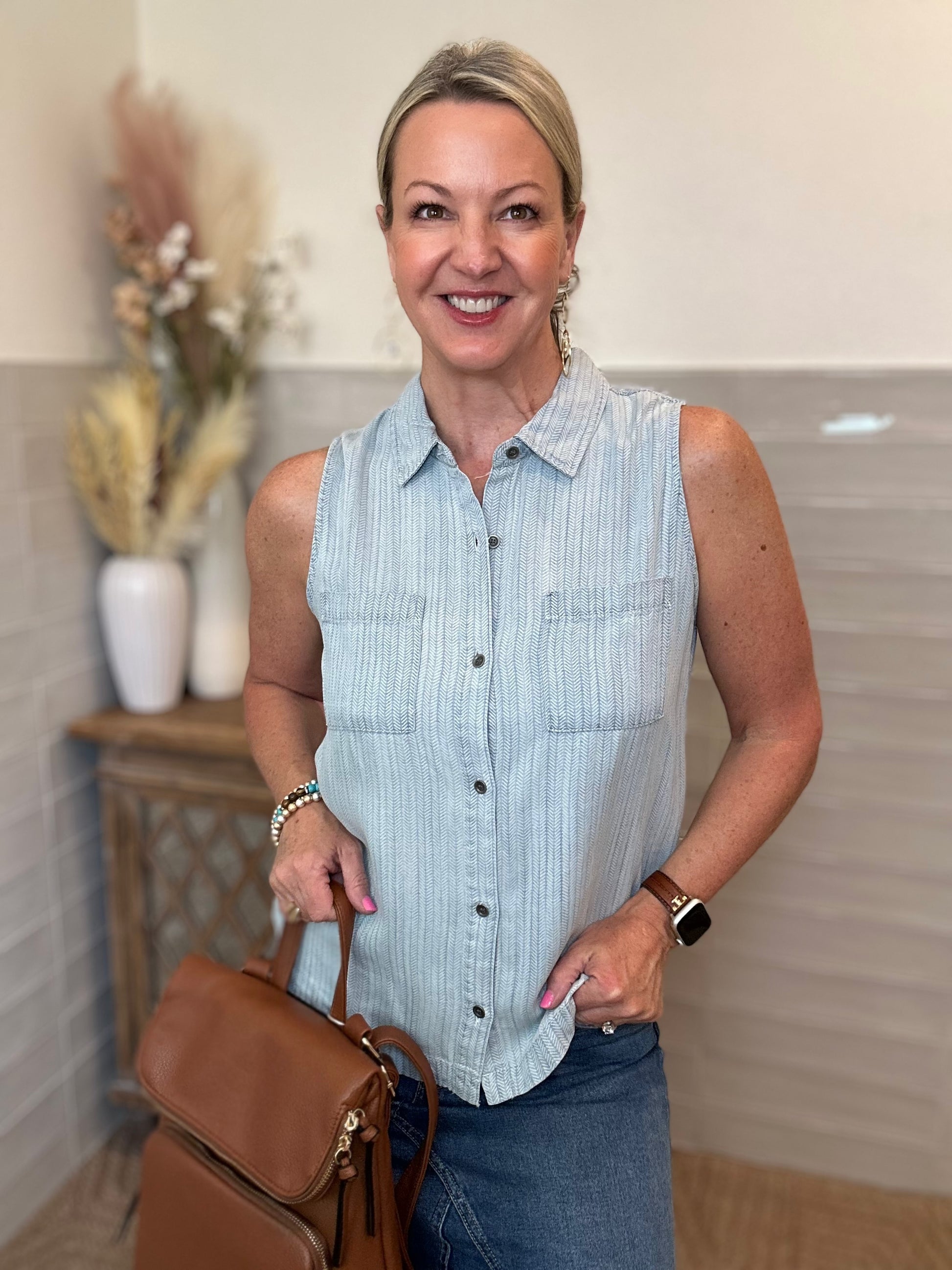 Featuring a collared neckline, a full button-front closure, and two chest pockets, the Blossom Tank Blouse combines classic details with effortless style.