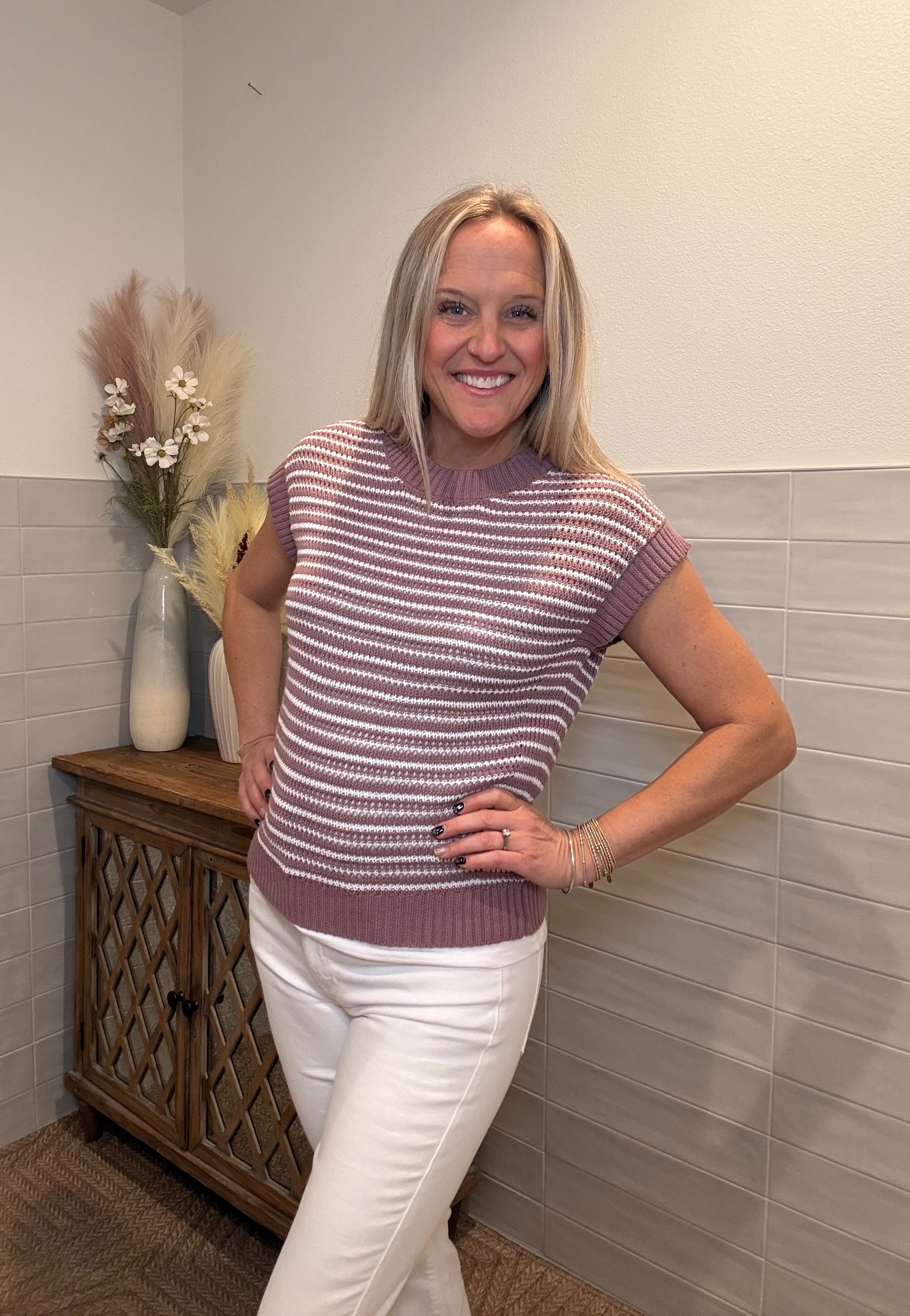 TEXTURE STRIPED, EXTENDED SHORT SLEEVE, CREW NECK, PULLOVER SWEATER TOP
