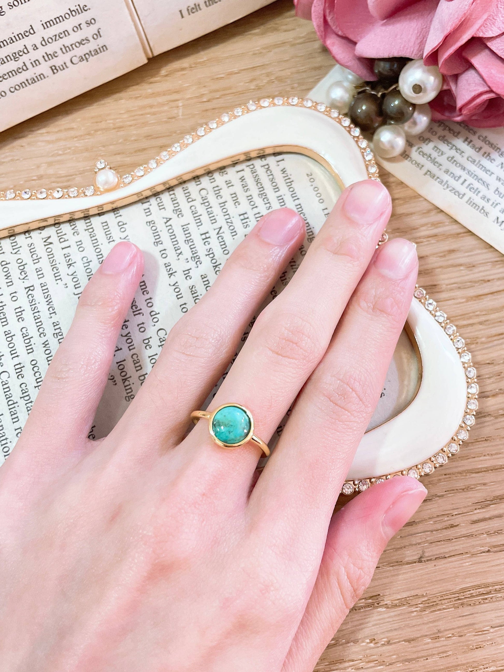 This exquisite Turquoise Cab Ring features a vibrant stone meticulously set in gold-filled metal. The natural variations in each turquoise cabochon create a sophisticated statement piece that complements both casual and formal attire.