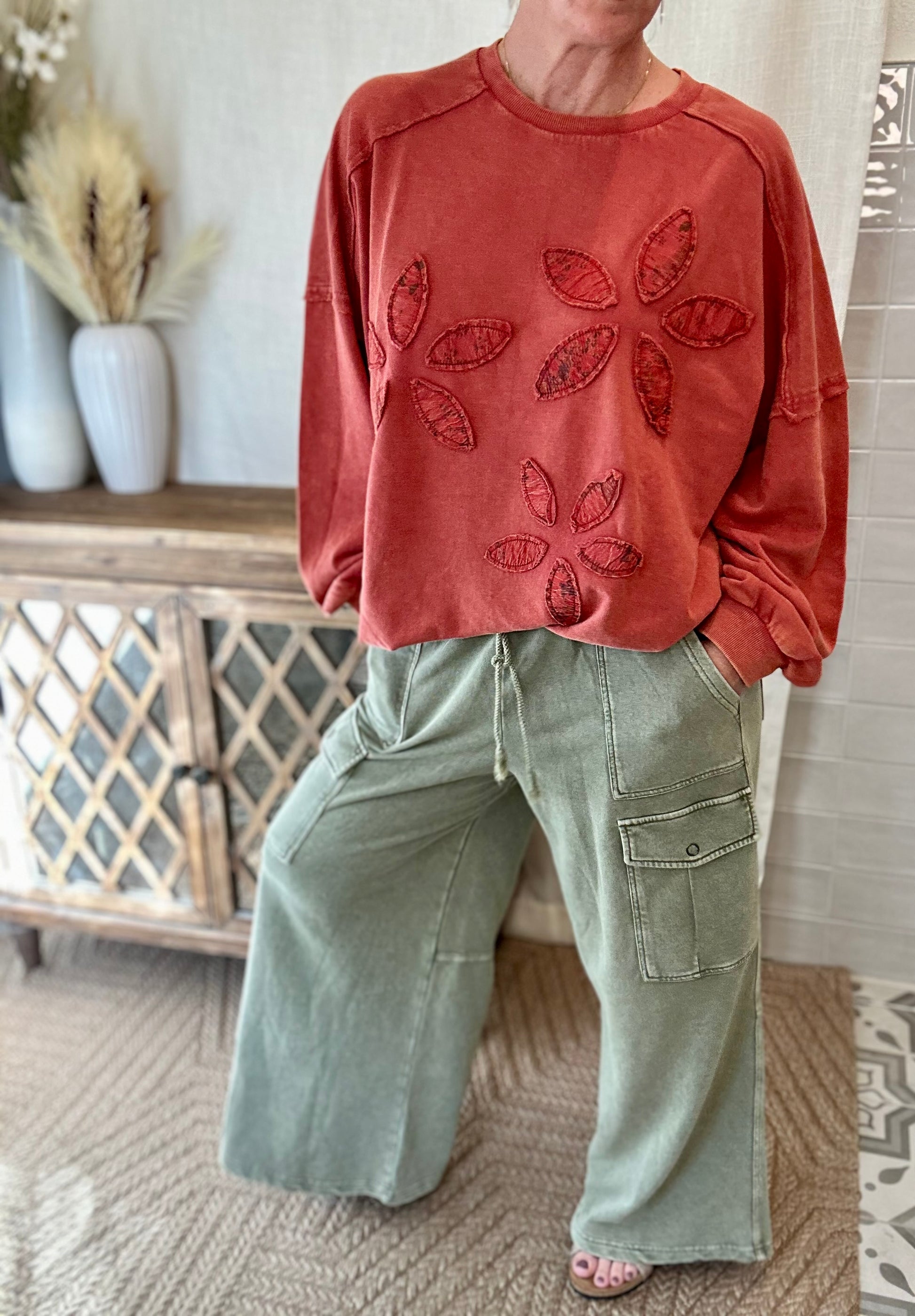 These washed cargo pants feature soft cotton French terry knit fabric and a relaxed wide-leg fit for comfortable wear. Designed with an adjustable covered elastic waistband and drawstring, they offer versatile ankle or full-length options. Practical side pockets and utility cargo detailing complete the look, enhanced by exposed seam accents for added style.
