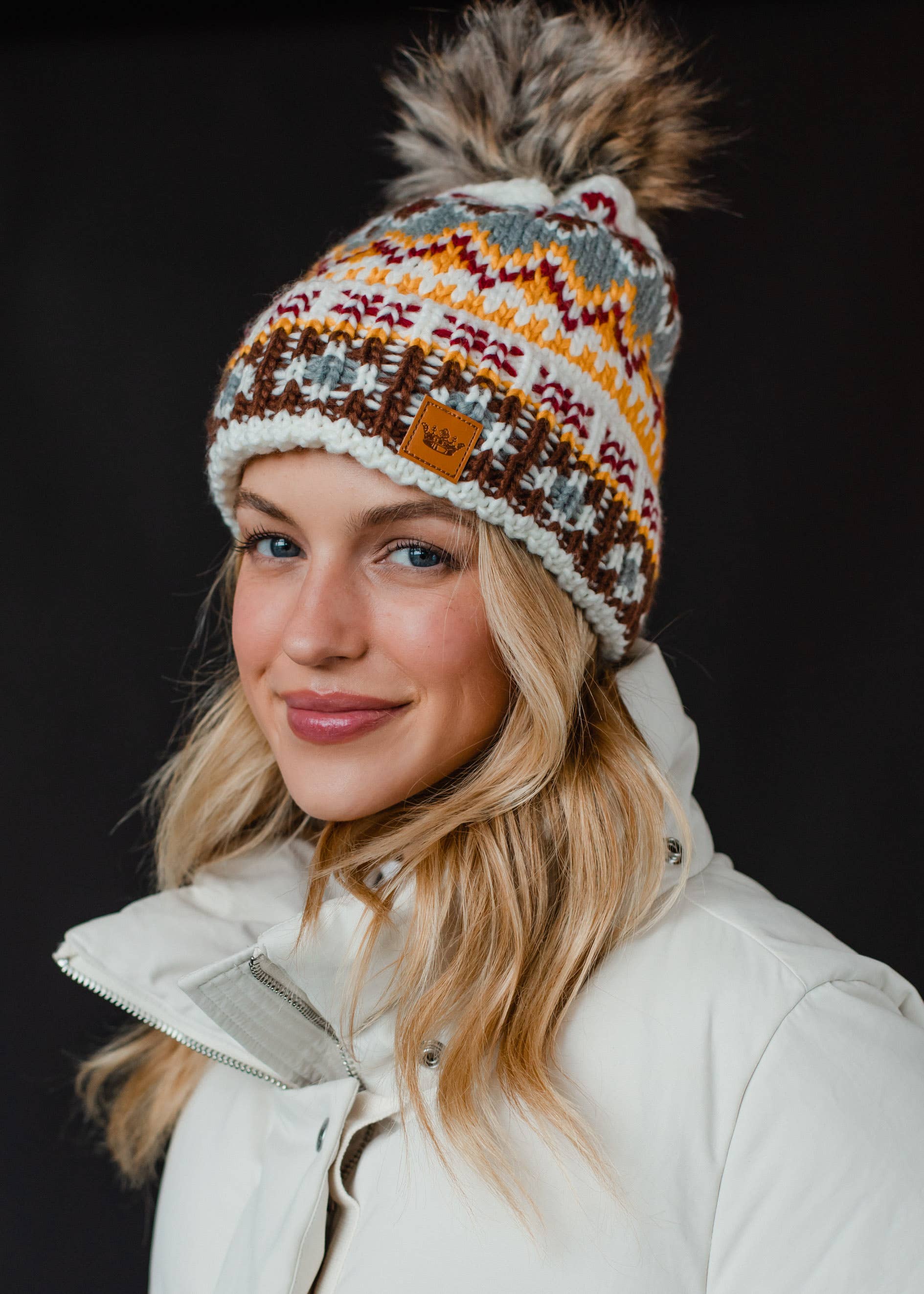 This knit hat features a vibrant white and multicolored pattern, topped with a soft natural faux fur pom. Fully lined with cozy fleece, it offers both warmth and style for chilly days.